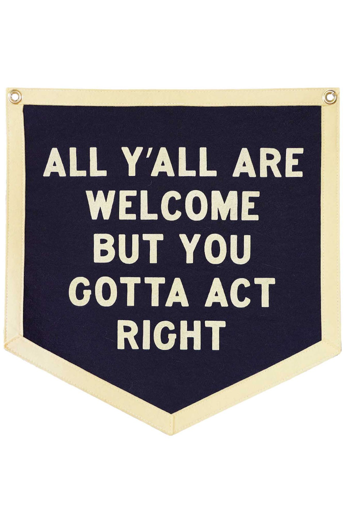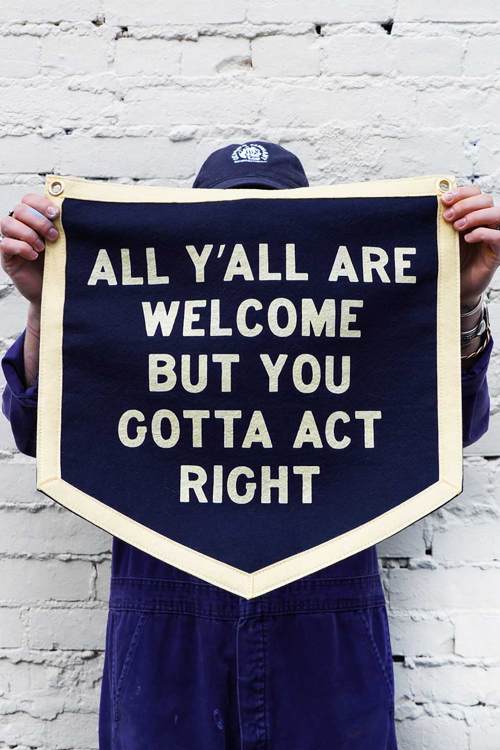 Originally coined by New Orleans artist Dr. Bob, "All Y'all Are Welcome, But You Gotta Act Right" is a favorite phrase of Evan and Melissa Tate of Tate Farms in Rockwall, TX. Tate Farms hosts community events, fundraisers and weddings at their farm. They also bring their delicious, best-in-the-world BBQ to events like Luck Reunion (Luck, TX), Under the Big Sky (Whitefish, MT) and Caveman Music Festival (Weston, CO).
