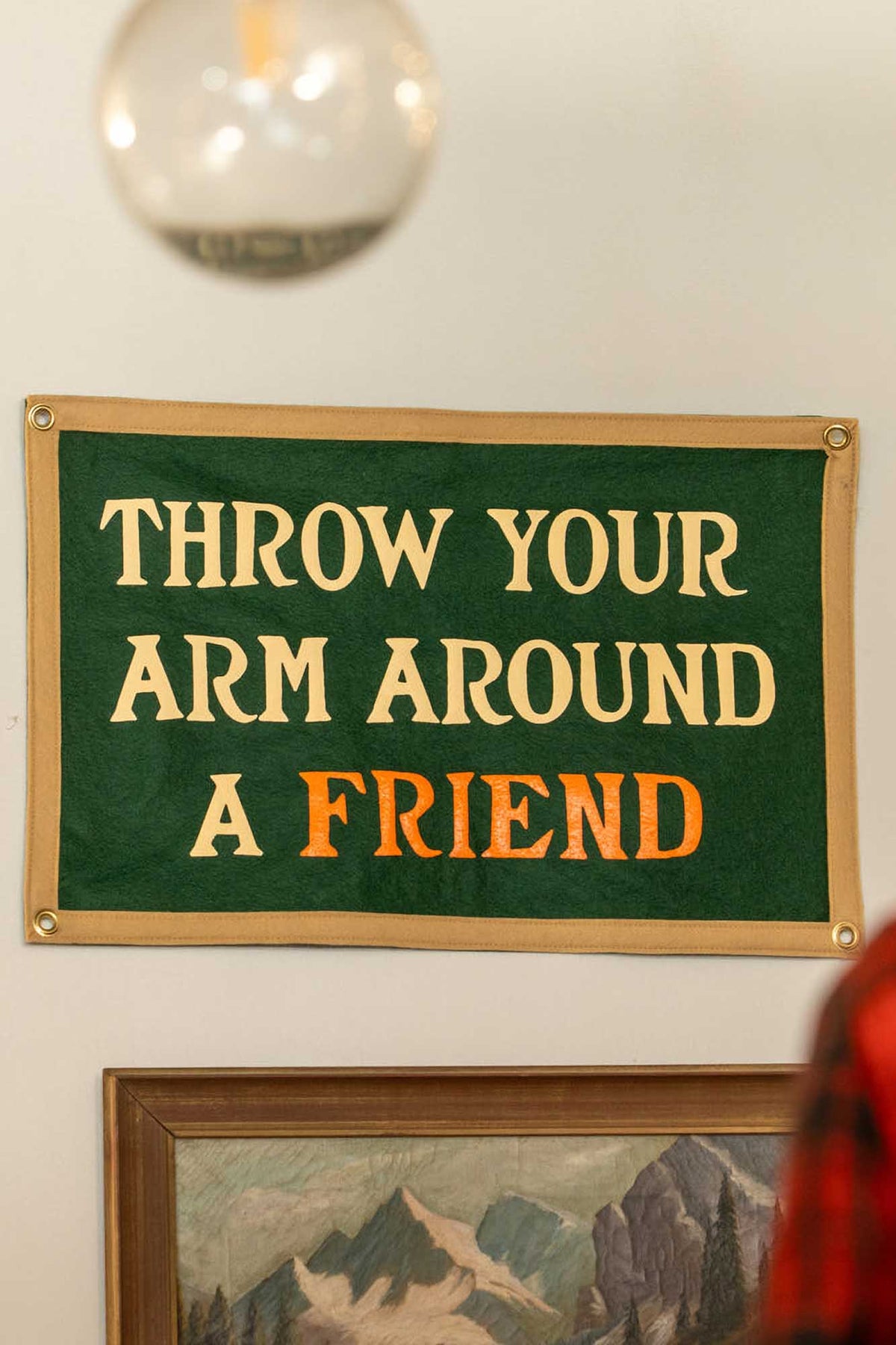 Good friends, good times, and a tune that never ends. Inspired by Billy Strings' lyrics, this camp flag is a reminder to keep your people close. Hang it in your home, jam space, or anywhere that calls for a little camaraderie. Because life’s better when you’ve got an arm around a friend.