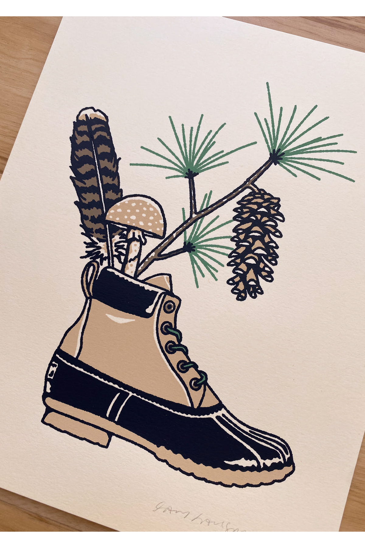 Printed with black, green and tan and brown ink on premium cream paper. Due to the paper being recycled a few specs may occur.