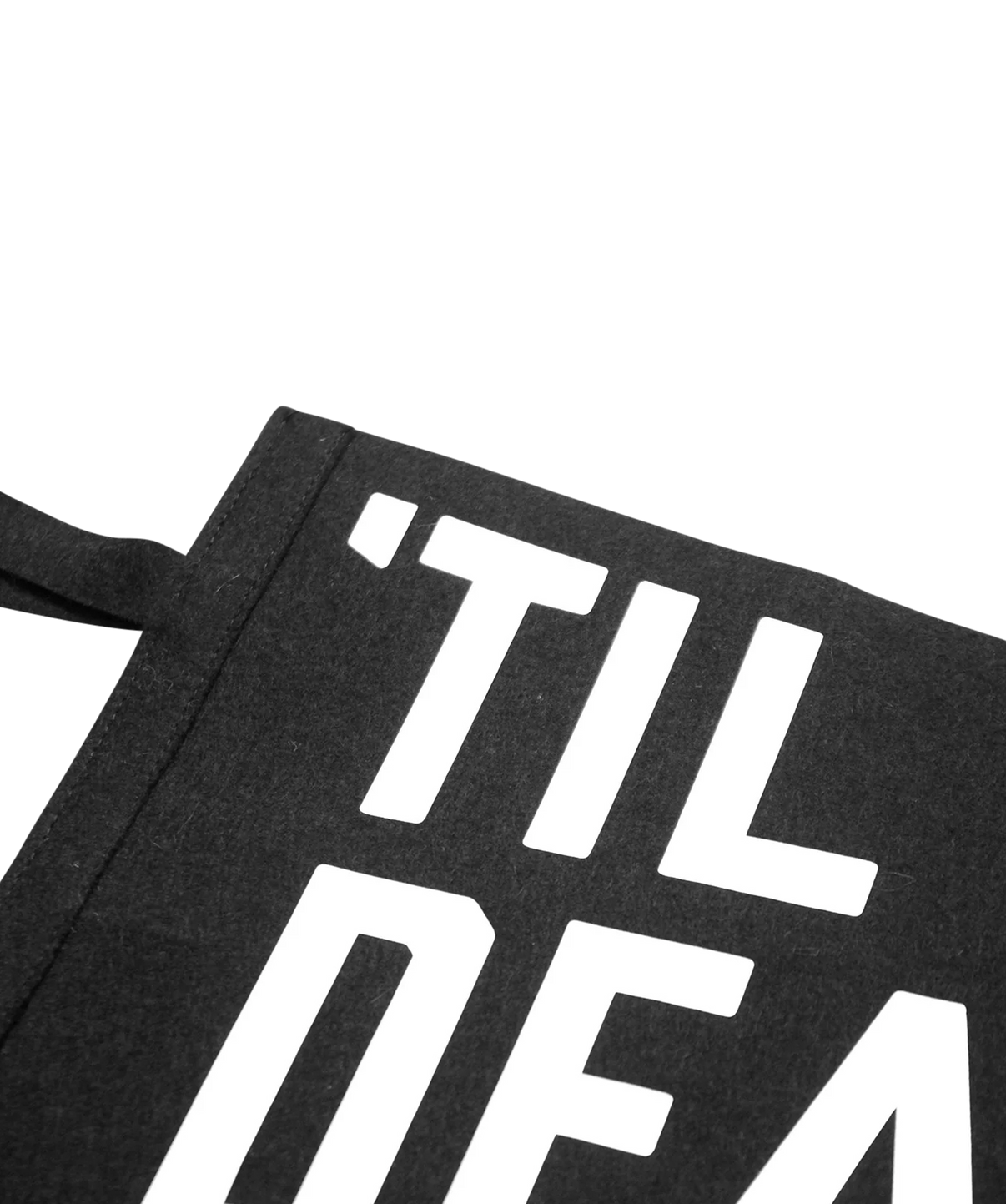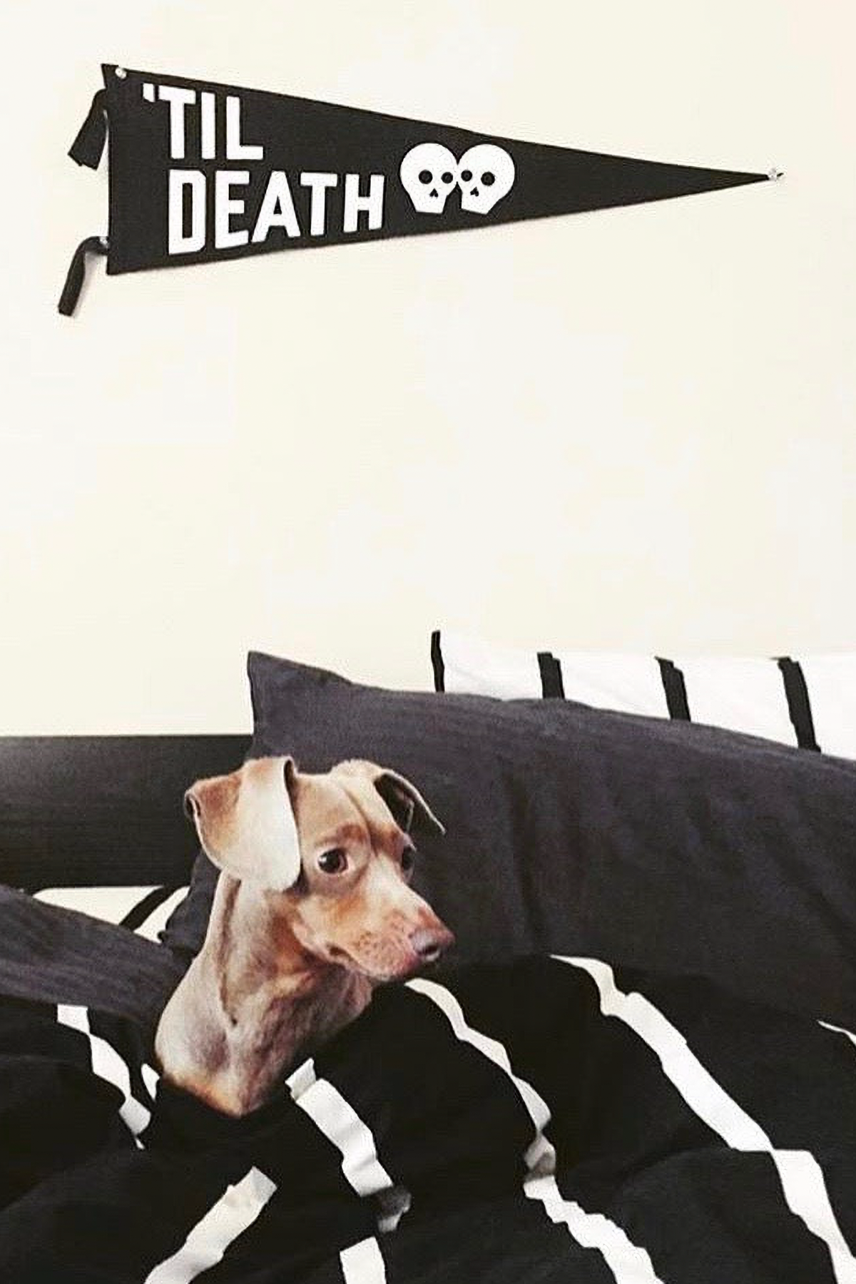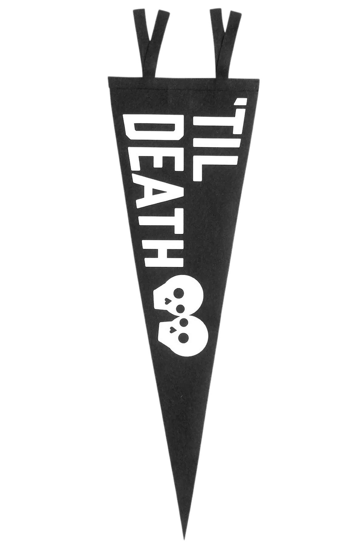 Sometimes it’s worth practicing a little Memento Mori when it comes to the lifelong commitment you make to someone. Featuring two skulls huddled together, this black and white pennant celebrates love while also contending with the reality of all life: that it has to end someday.