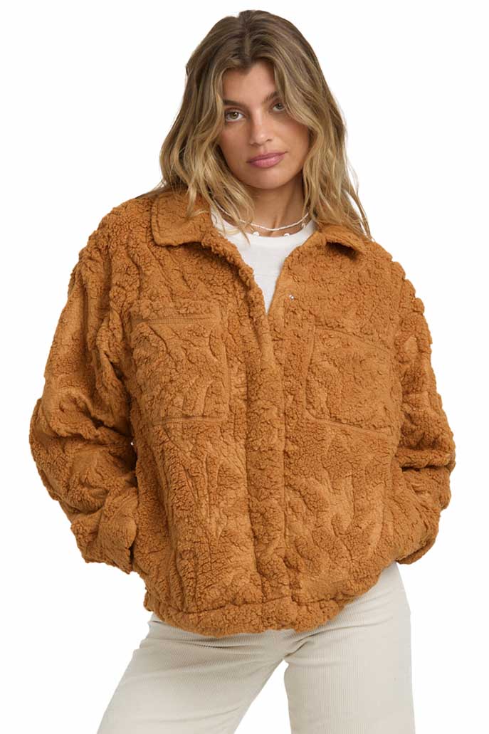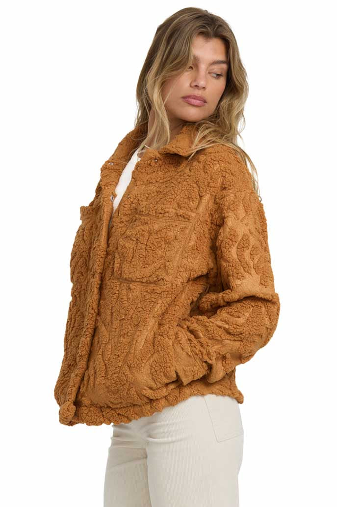 Cozy sherpa shacket brings practical style with its oversized silhouette and all-over print. Multiple pockets and button details make this piece as functional as it is fashionable for your everyday adventures. Featured here in the Beige colorway.