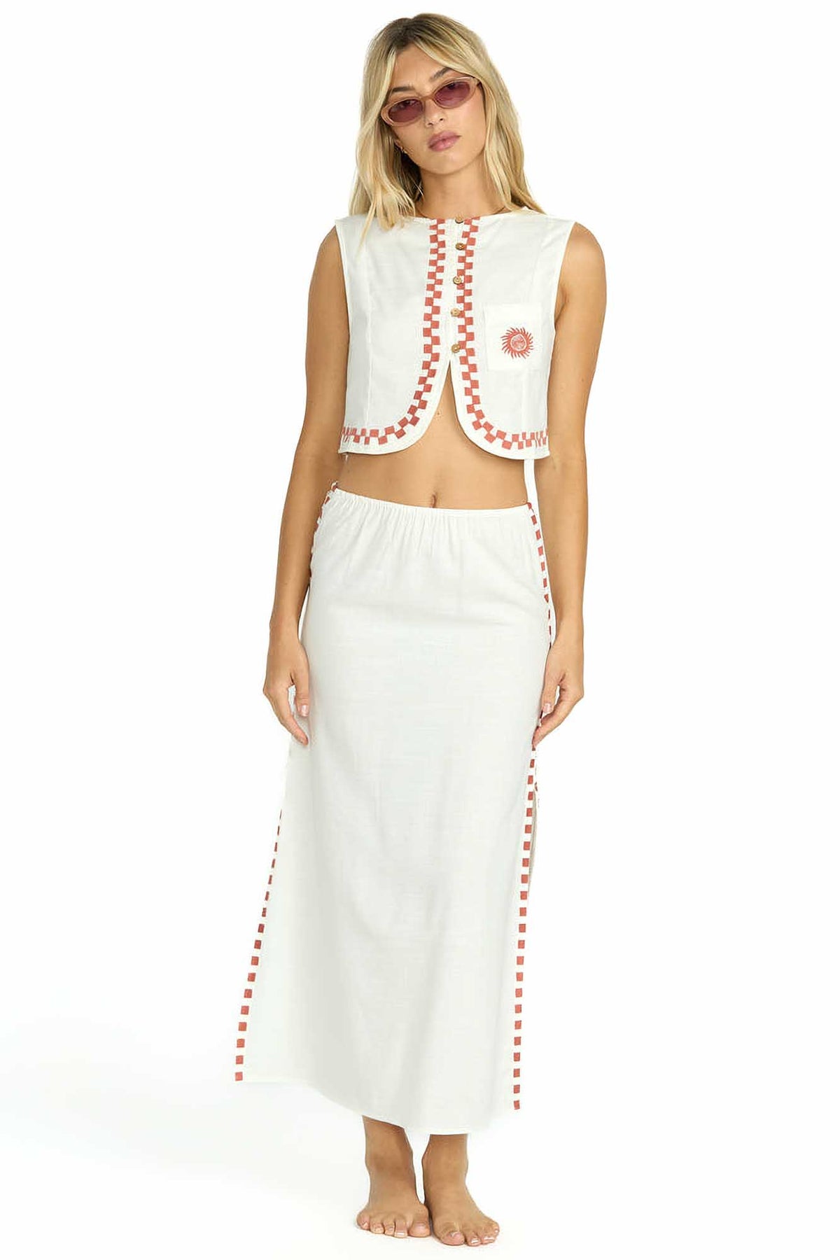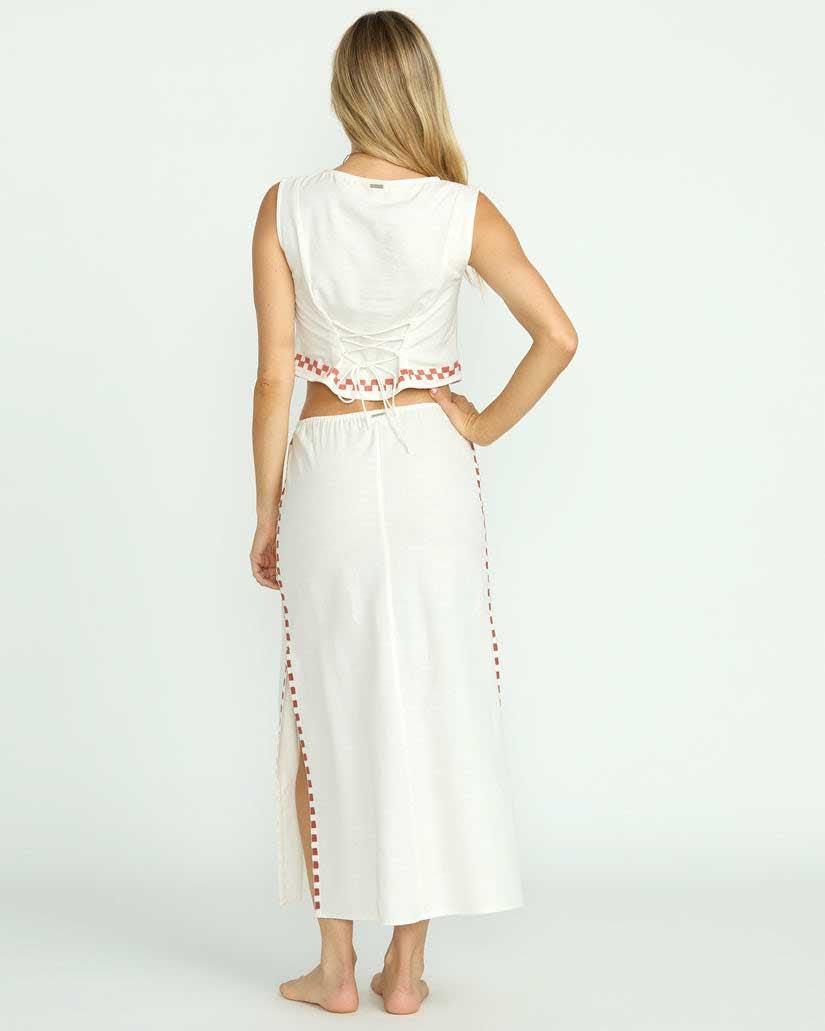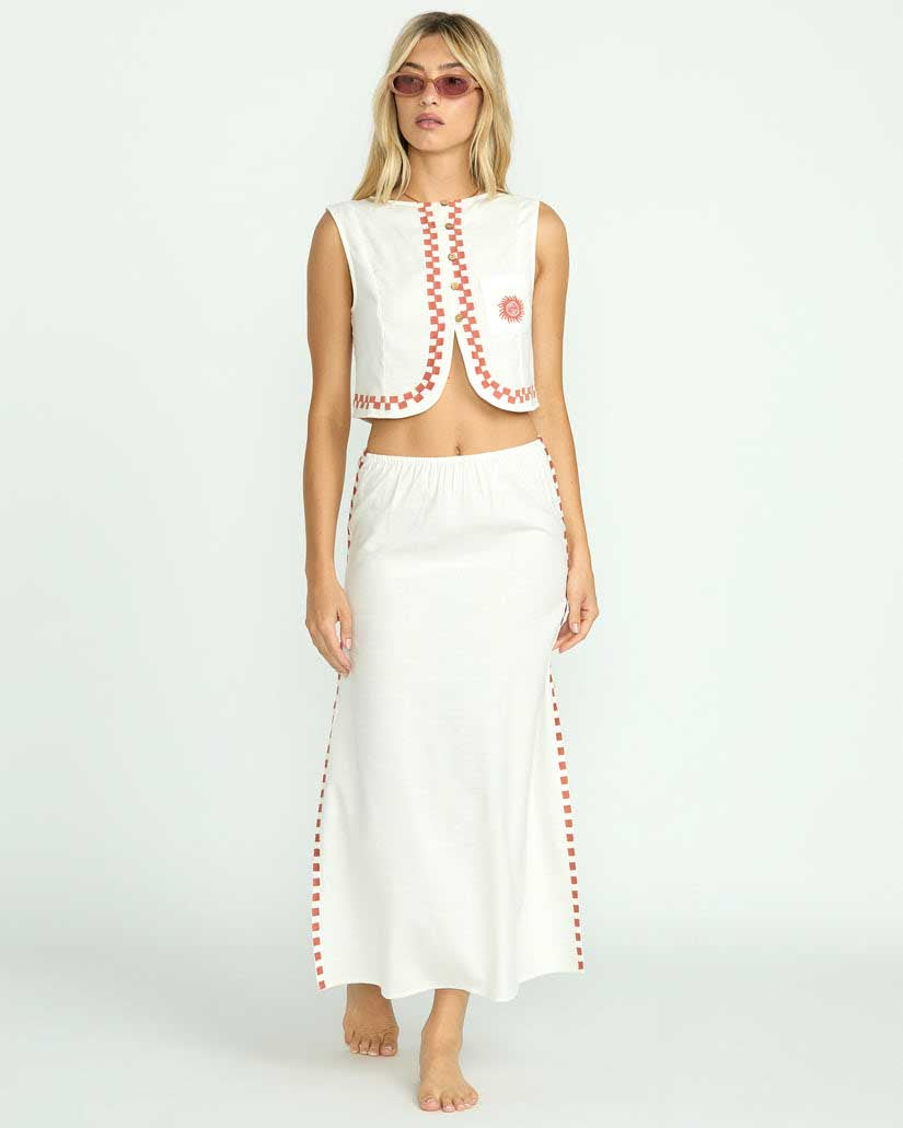 Breezy yet stylish, Billabong's Secret Cove Skirt in a cotton-viscose slub boasts a midi skirt length, body skimming fit, and embroidered accents for effortless casual-cool.