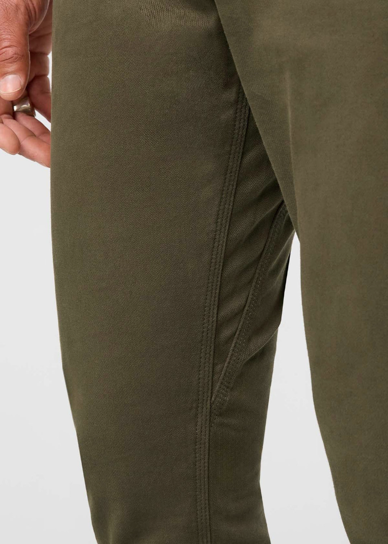 Plant-based fabric with the structure of a woven and the softness of a knit, offering the comfort of a sweatpant with a more elevated appearance. The plant-derived TENCEL™ fibres naturally inhibit bacterial growth and provide a soft hand feel, further enhanced by stretch for added comfort.