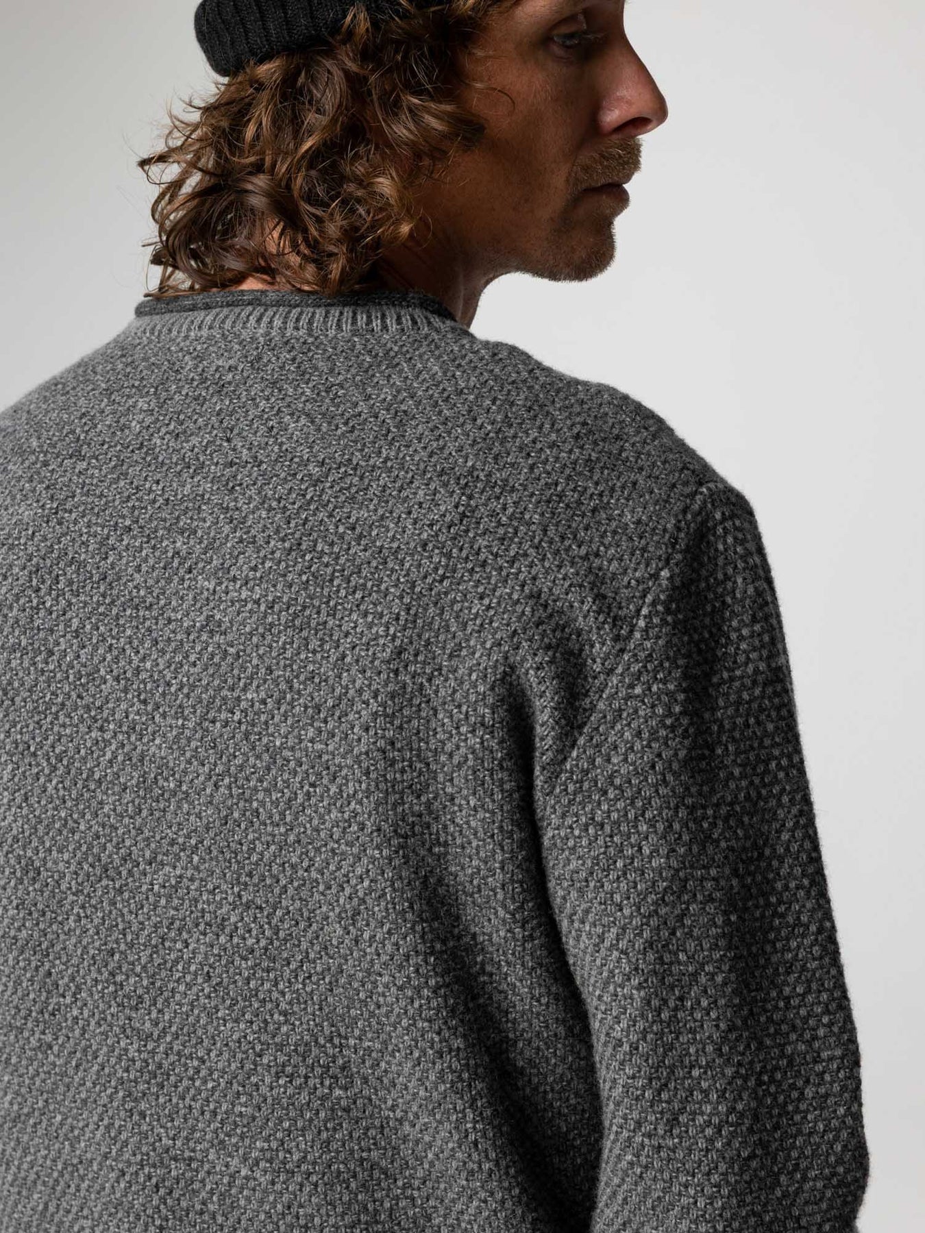 A heritage inspired knit that's become a firm favourite among our community. Constructed with a soft 80% wool and recycled polyamide blend to maintain shape and structure, its all-over textured fisherman's stitch is thick enough to keep out the cold, yet thin enough to layer easily under a jacket.