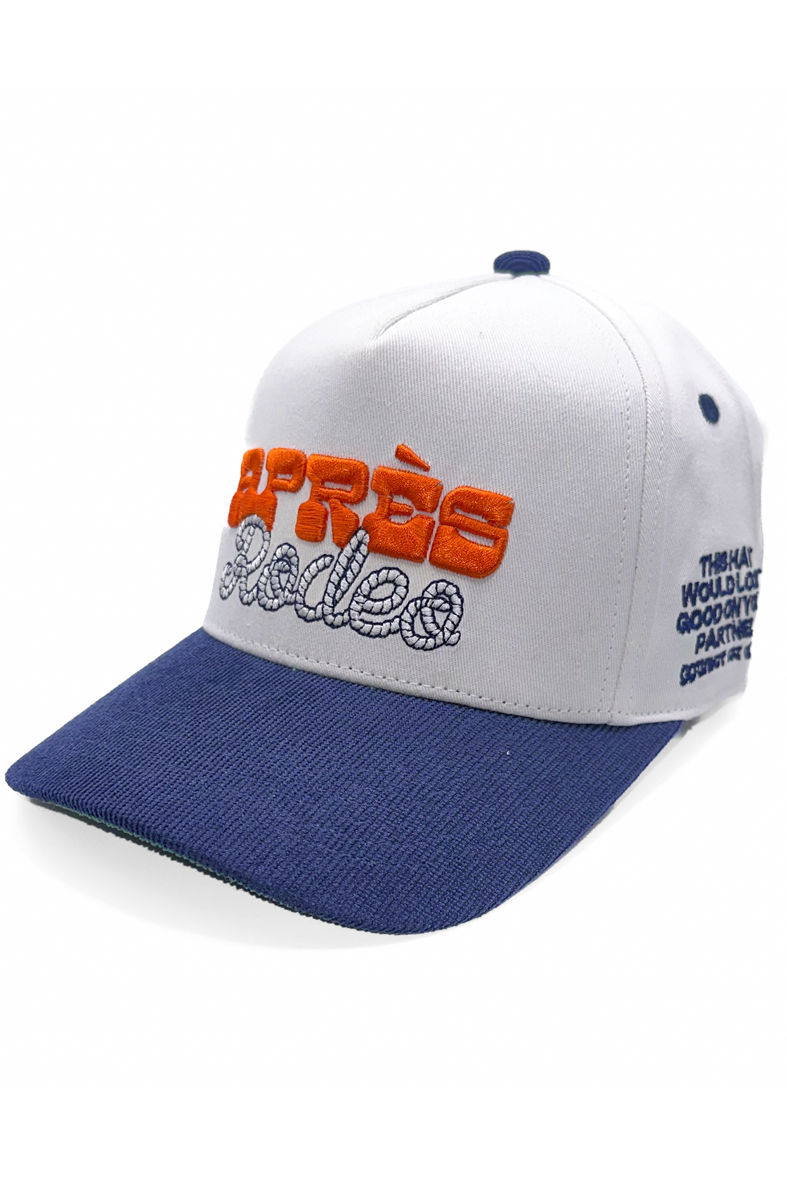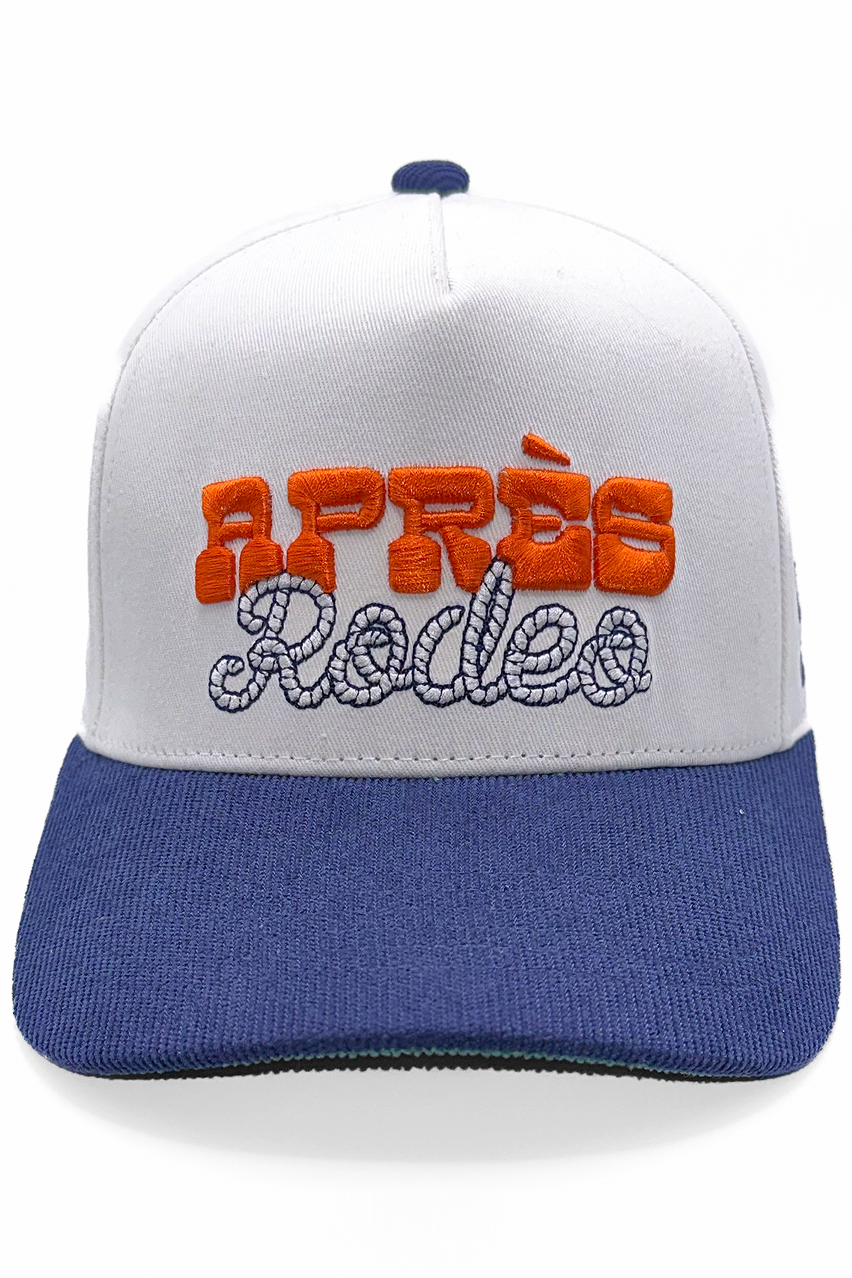 Après Rodeo Corduroy Hat features a puff and lasso-stitch front panel, a contrasting navy corduroy bill, and green vintage under-bill.