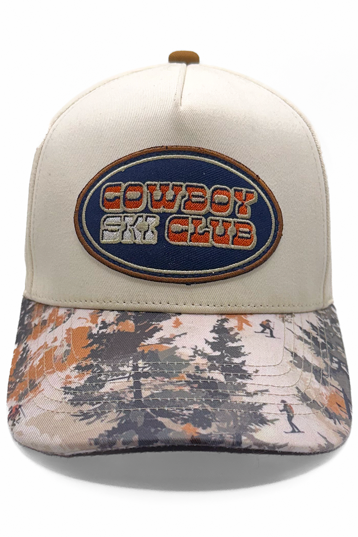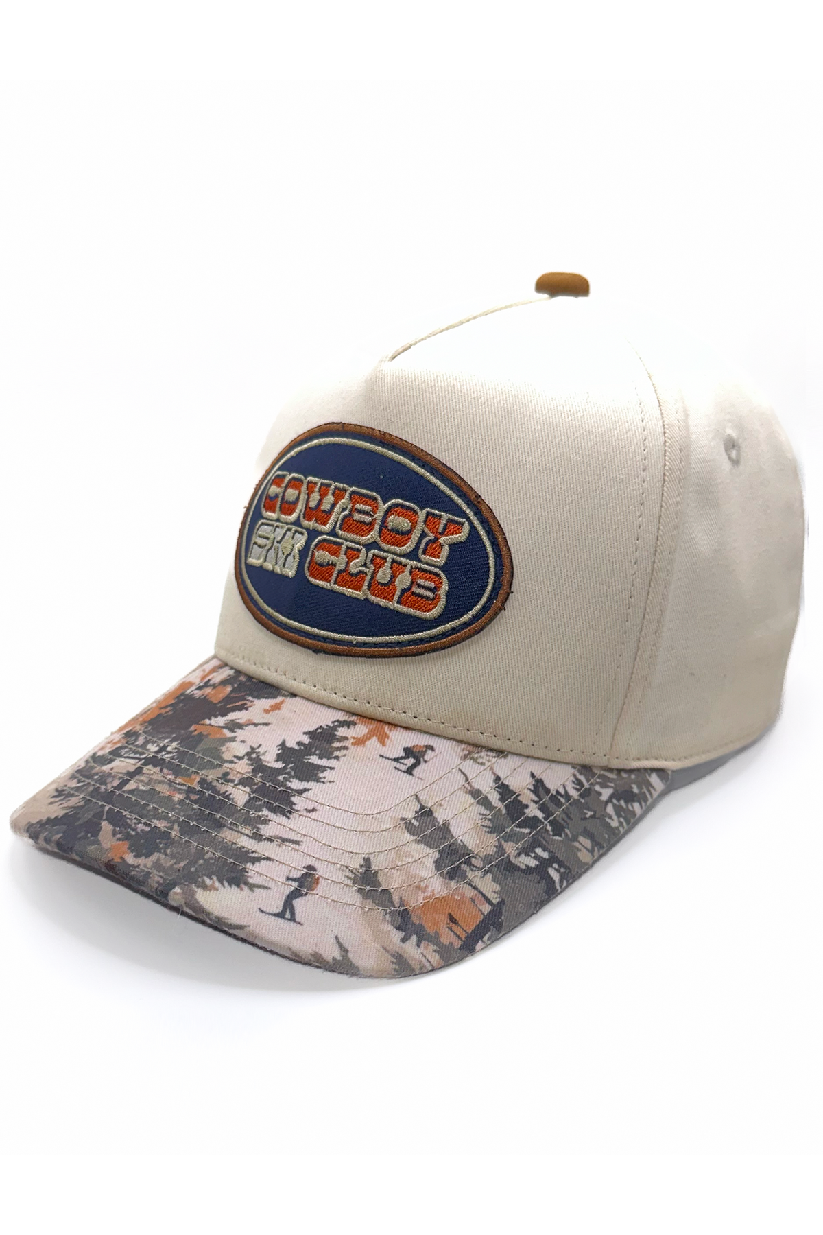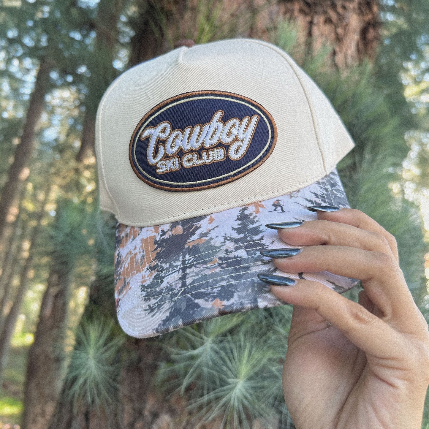 The Treeline Camo Hat features an embroidered Cowboy Ski Club patch, and Custom Treeline Camo patterned bill.