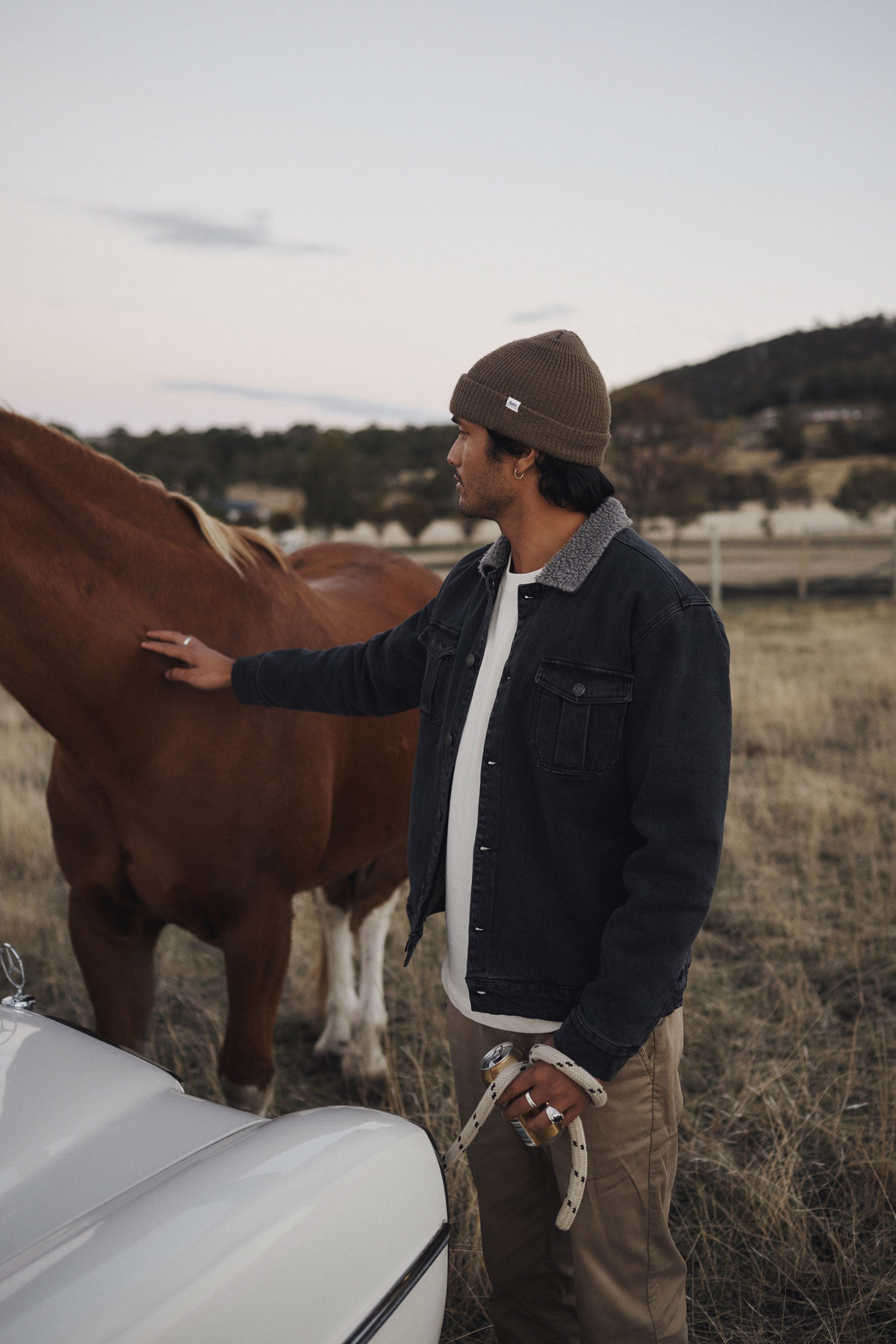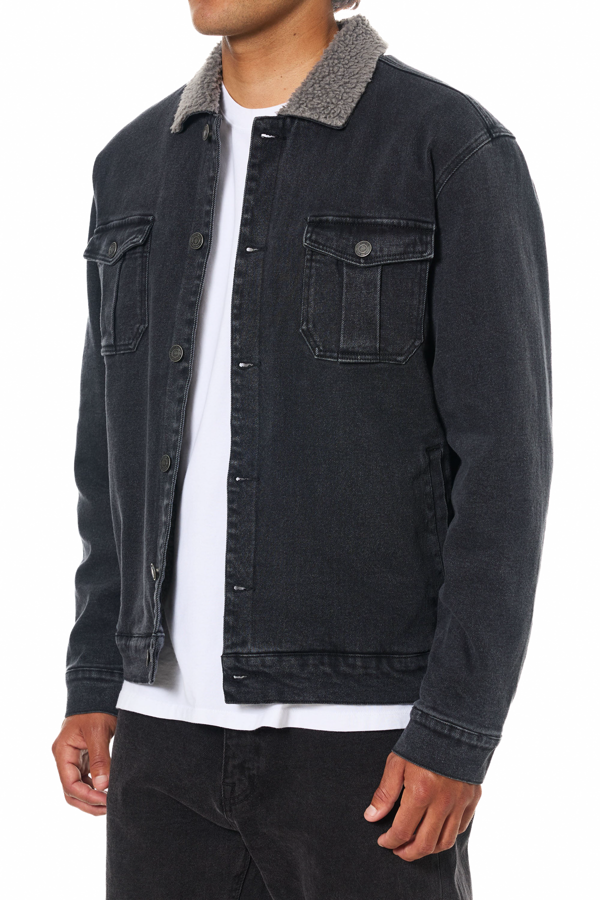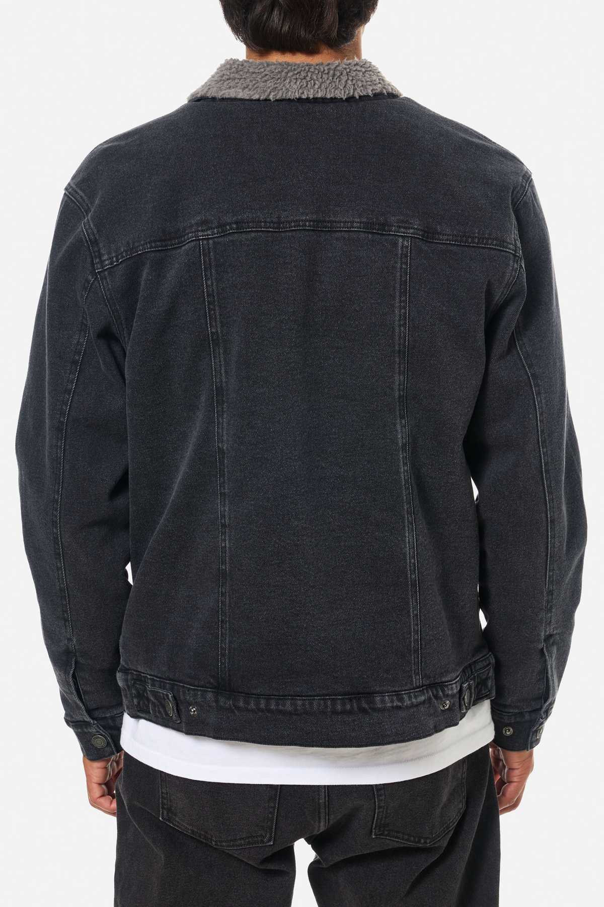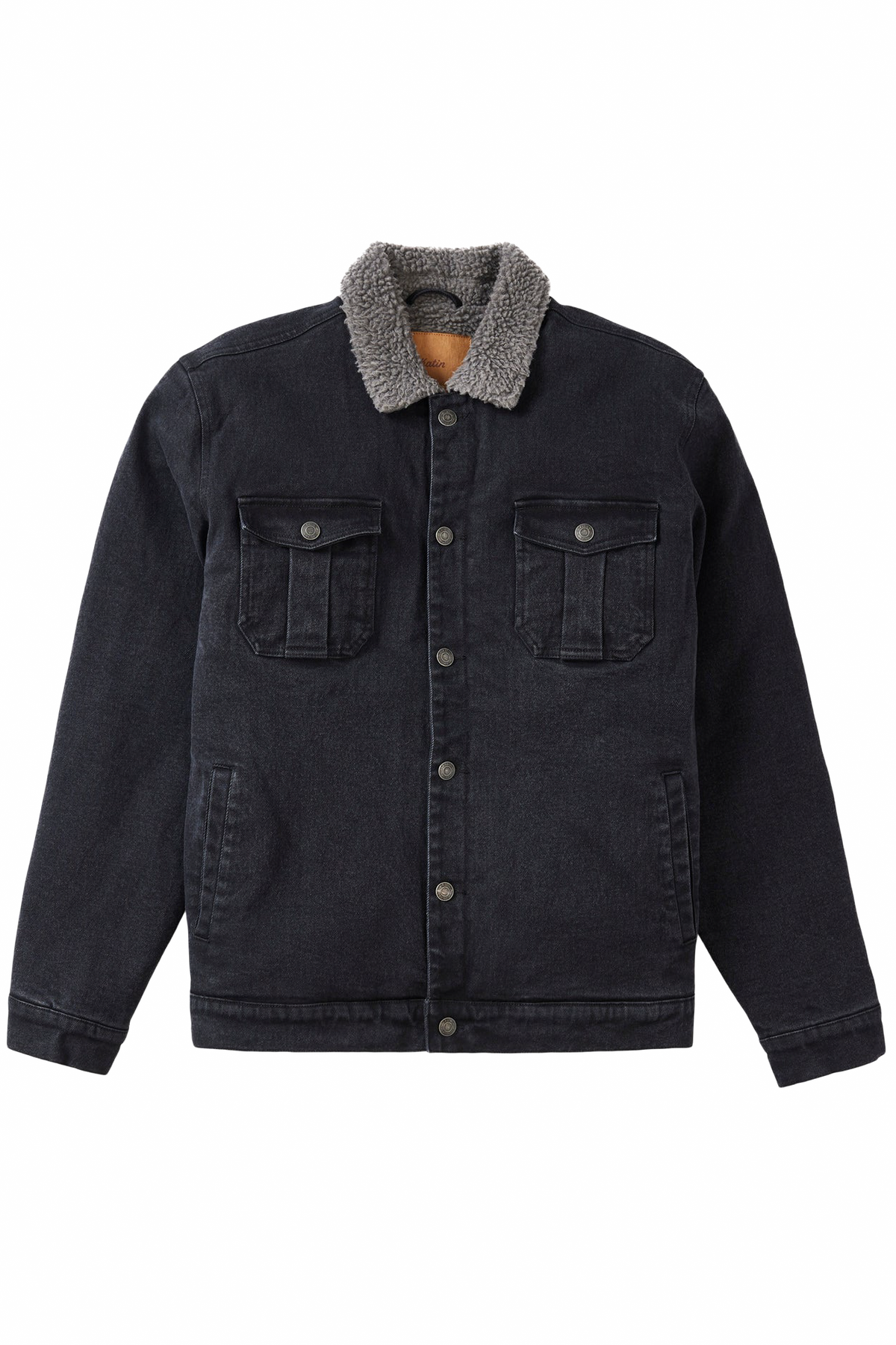 The Harris Denim Jacket features a denim shell, custom sherpa body liner, taffeta sleeve lining, sherpa collar, front welt pockets, and chest patch pockets.