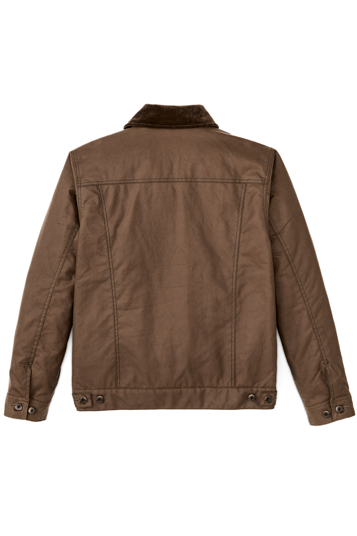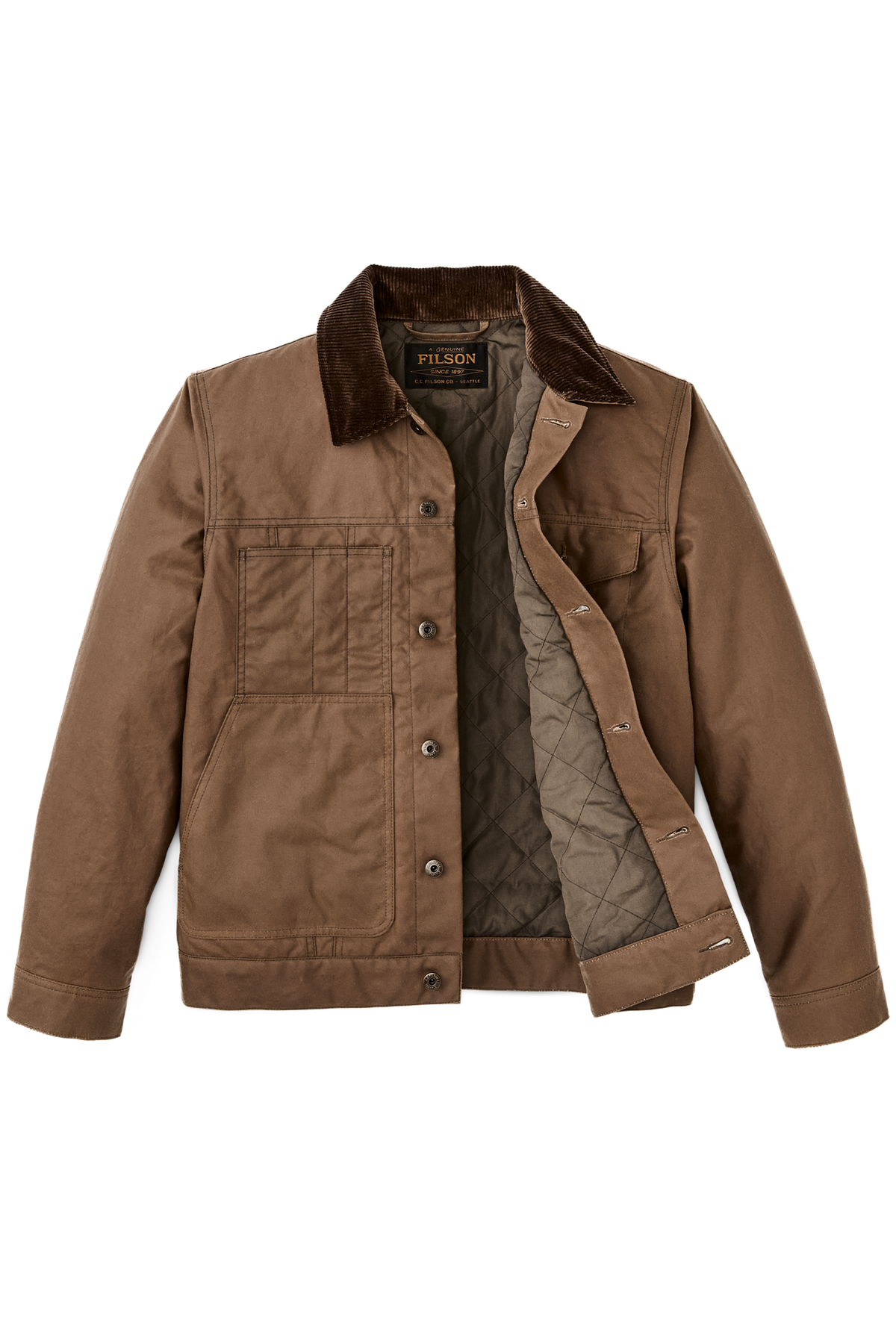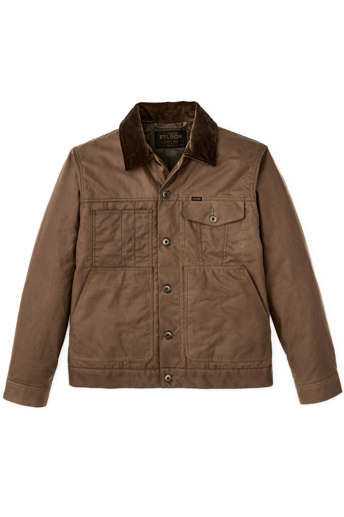 The Insulated Short Cruiser is made with our signature Shelter Cloth waxed cotton. At 11-oz. per square yard, this fabric is midweight for Filson, yet still heavier-duty than its imitators. Strong and flexible, Shelter Cloth comes from England's famed British Millerain, waxed-cotton pioneers since 1880. The PrimaLoft insulation is lightweight and will continue to trap heat even if it gets wet. The collar and cuffs are lined with 100% cotton corduroy for comfort against the skin. Virtually unbreakable metal-shank buttons secure the front closure and waist-adjustment tabs. Large hand pockets plus flapped and slotted chest pockets.