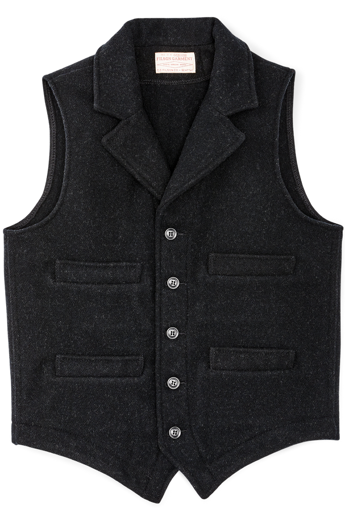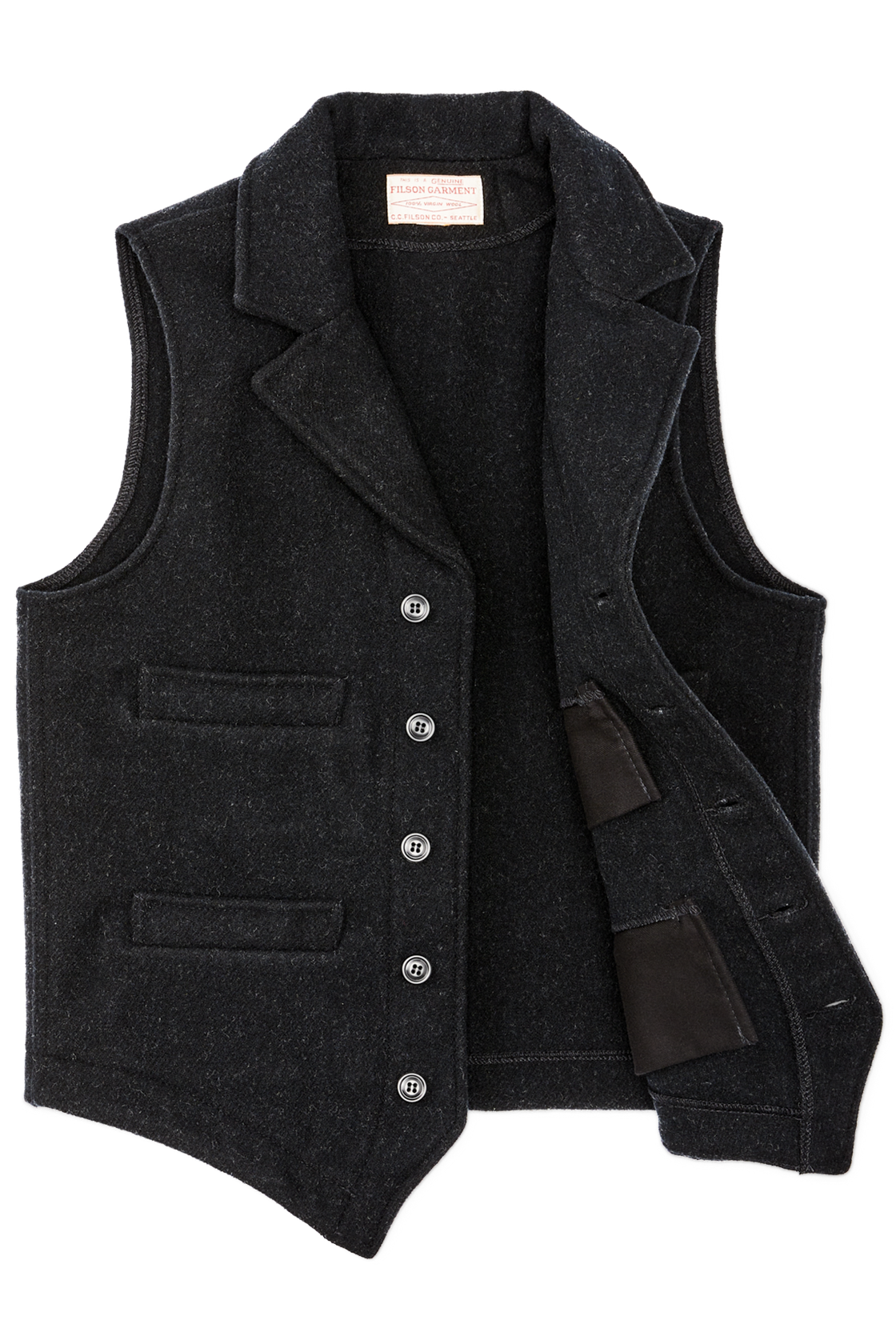 Mackinaw Wool Western Vest shrugs off wind and light rain while providing warm insulation, wet or dry. The notched lapels and pointed hem are a nod of respect to the bold pioneers who settled the West. Vests, known as waistcoats in Britain, were considered a requirement for proper attire in those days. The front pockets were sized and located for quick access to timepieces. Those same features that made the vest an indispensable garment on the range make our Western Vest a companion no matter where your journey leads.