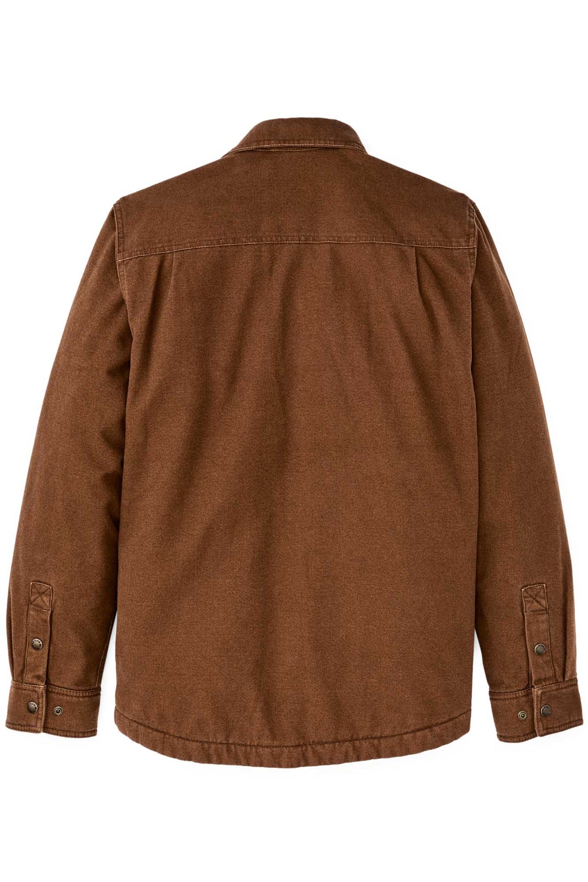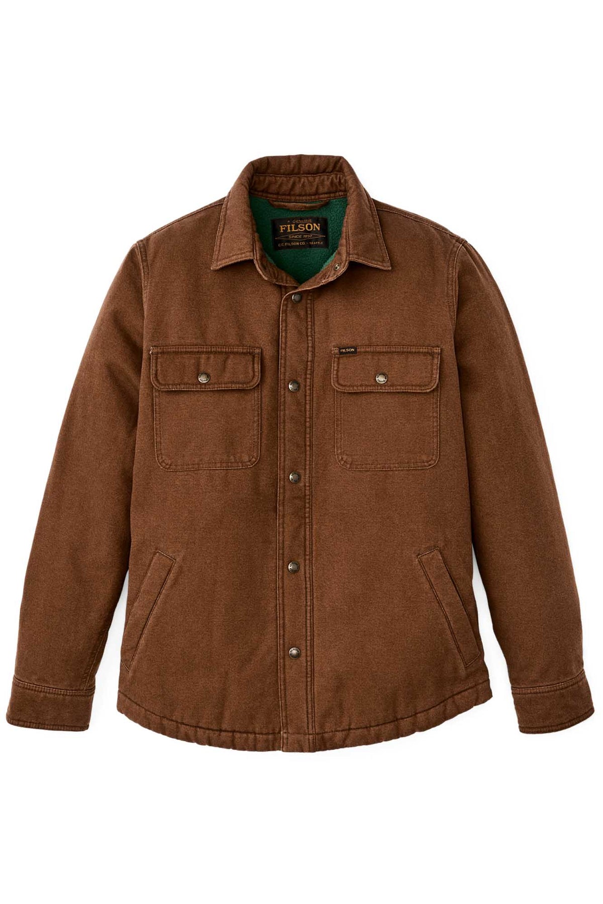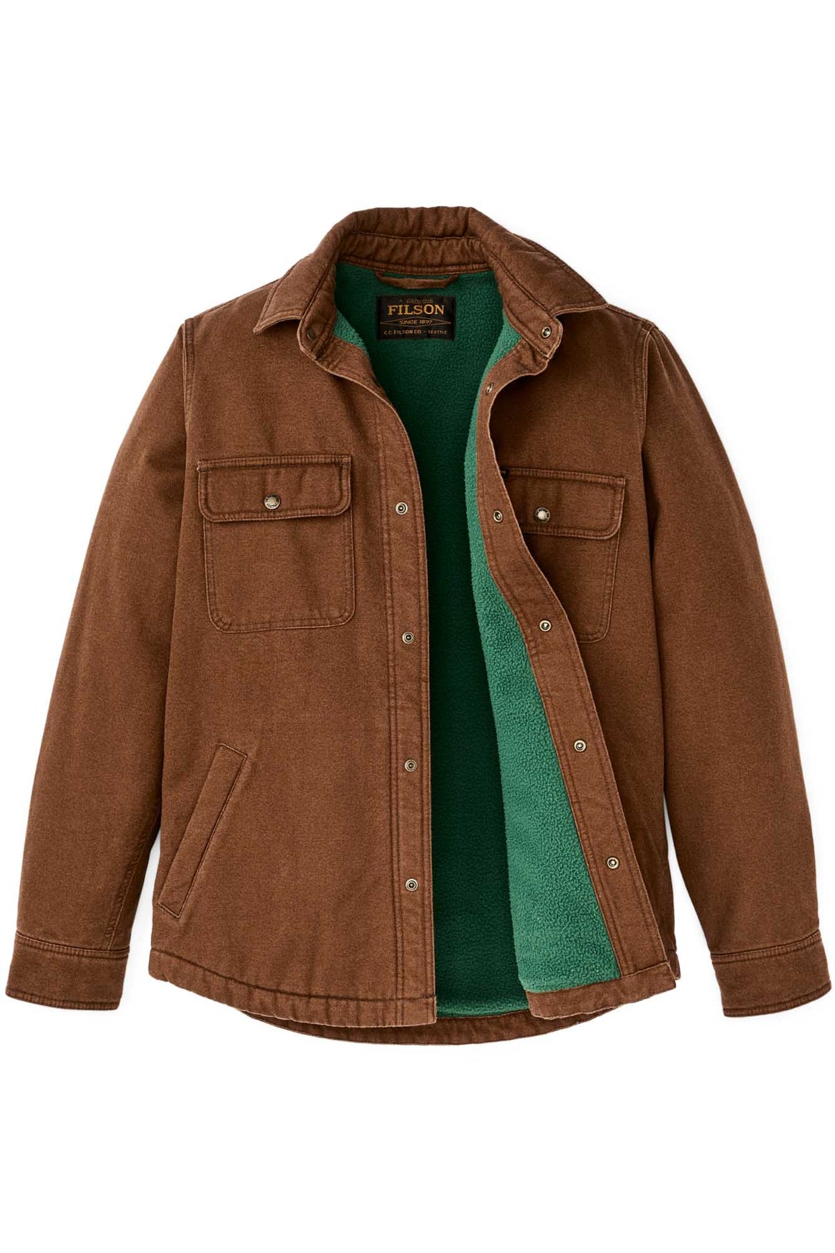 Fleece Lined Jac-Shirt bolsters a trusted Filson staple with insulation for colder weather. it's built with sturdy 10-oz. cotton canvas for years of reliable service and lined with fleece in the body and polyfill in the arms. Garment-washed for a well-worn feel from the first wearing. Pleated shoulders for range of motion. Fleece-lined handwarmer pockets.