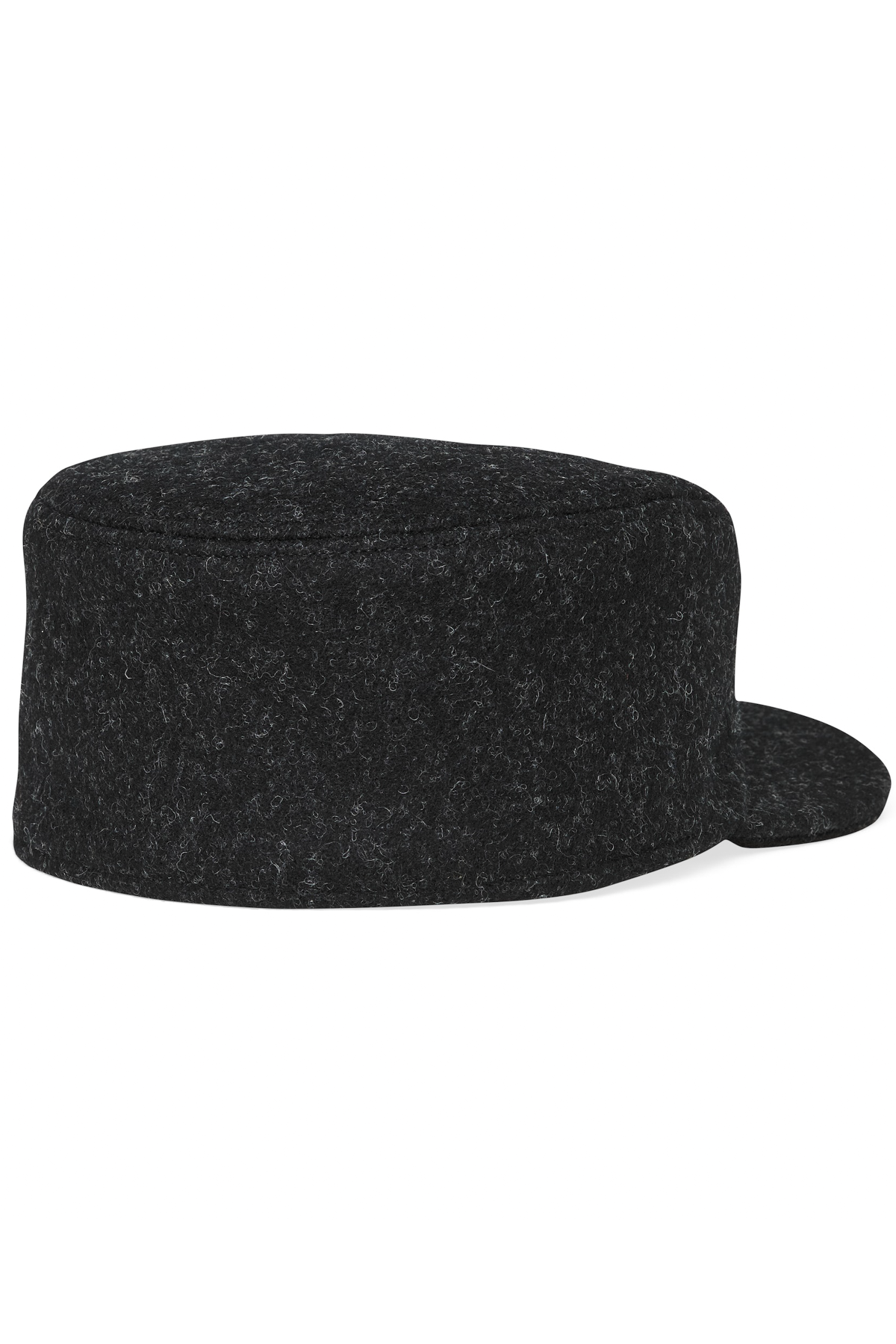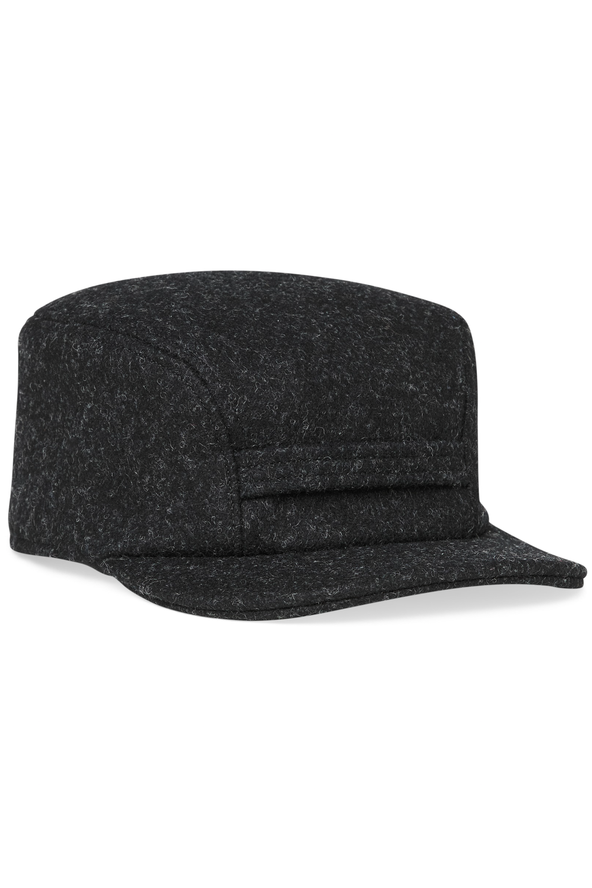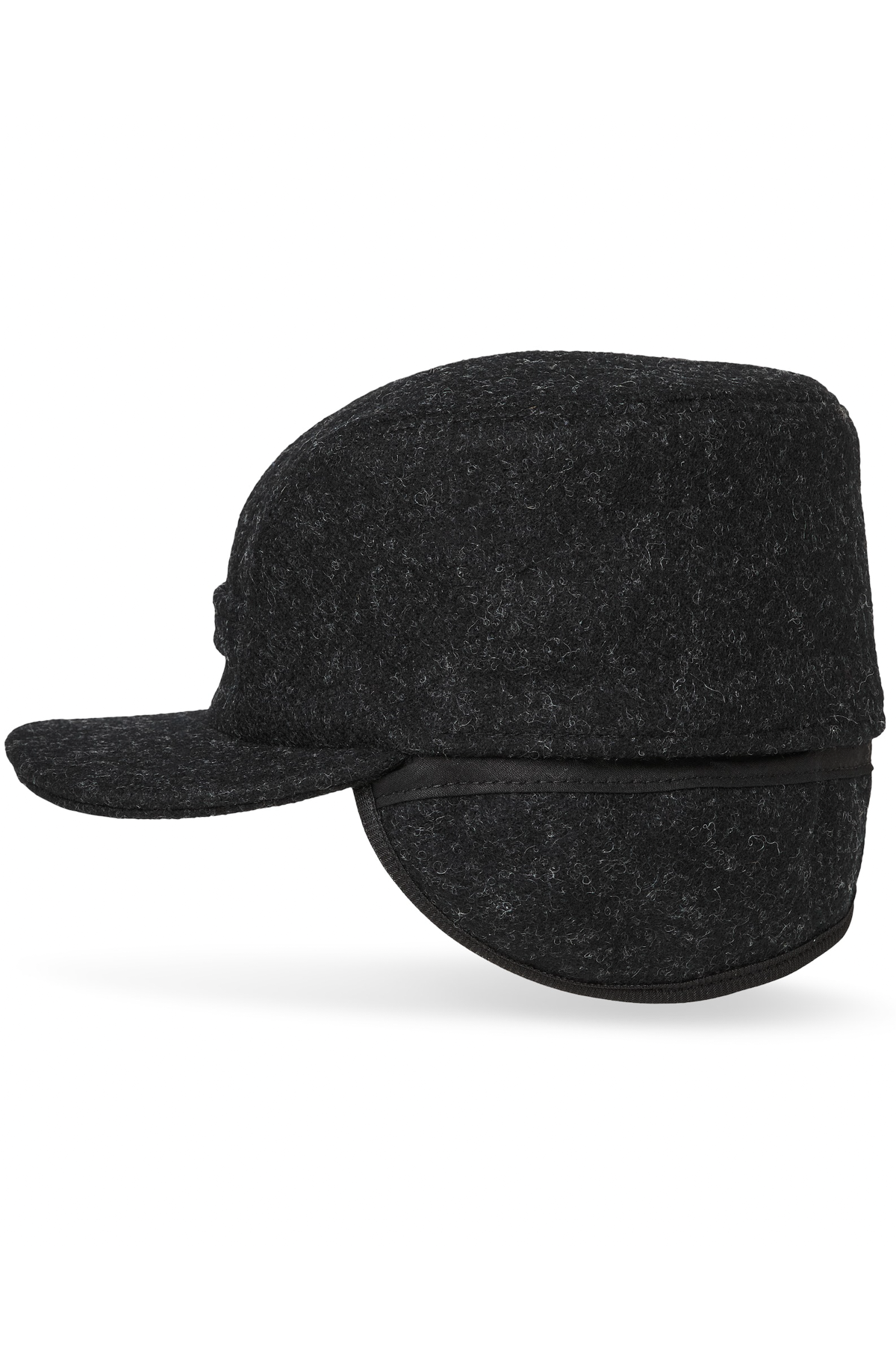 A warm wool cap with hidden earflaps, a 2"-wide bill and an insulated crown.