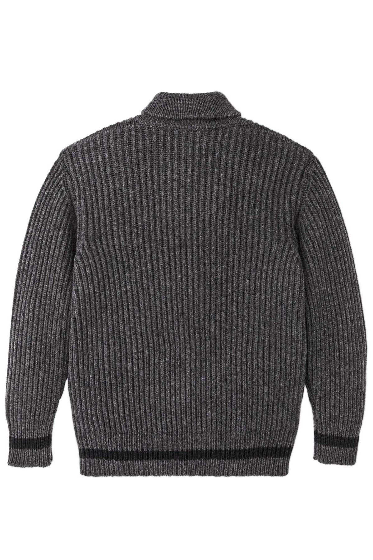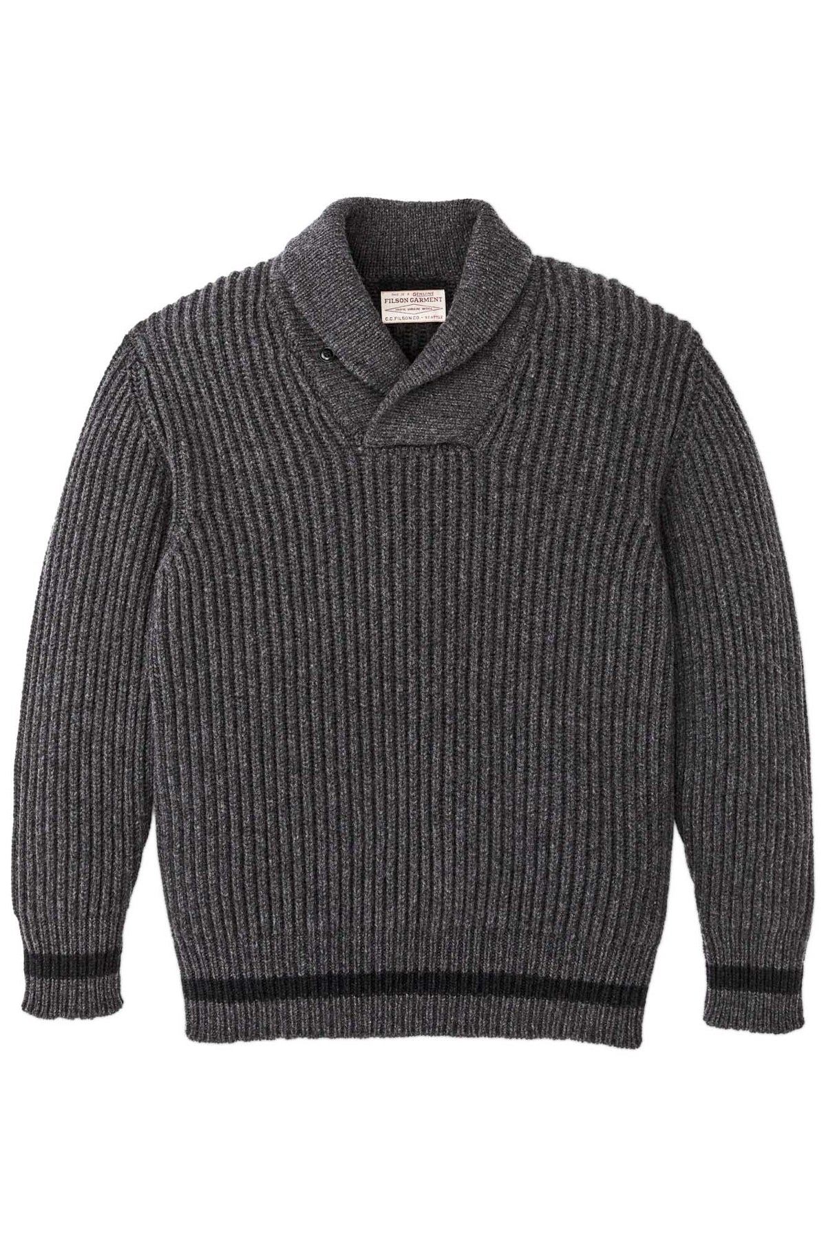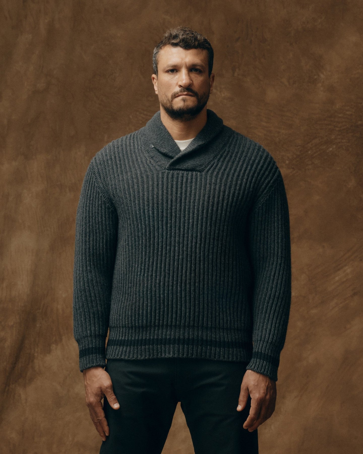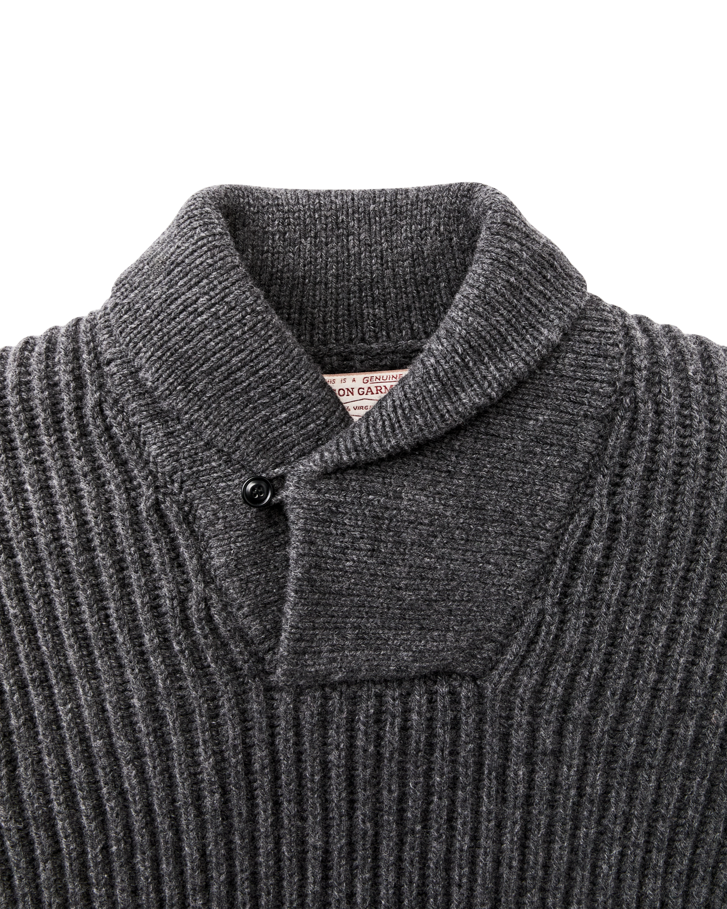 The Bristol Shawl-Neck Sweater is crafted with 100% wool. This thick, dense pullover features a distinctive vertical fisherman's rib that adds warmth and structure. The shawl collar can be turned up for neck protection against cold wind. Rib-knit cuffs and hem hold their shape and seal in the heat.