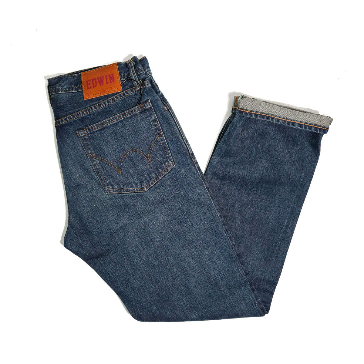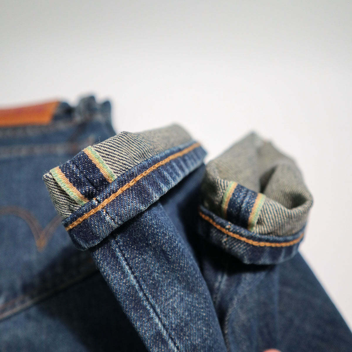 EDWIN's new Japanese Rainbow Selvedge Denim weighs in at 13.5oz, and is custom woven by Kaihara Mills in Japan on vintage machinery, woven at a low speed and tension to create truly vintage selvedge denim. A mixture of American and Australian long-staple cotton are used for a softer hand, with the additional benefit of the stark white colour of these cottons allowing a deeper indigo dye to occur. The warp and weft threads are spun differently for traditional texture, with the warp featuring natural middle-pitched uneven yarns to allow 1940's/50's esque fading on the warp, while the weft incorporates shorter-pitched uneven yarns, twisted tightly for a crunchier weave.