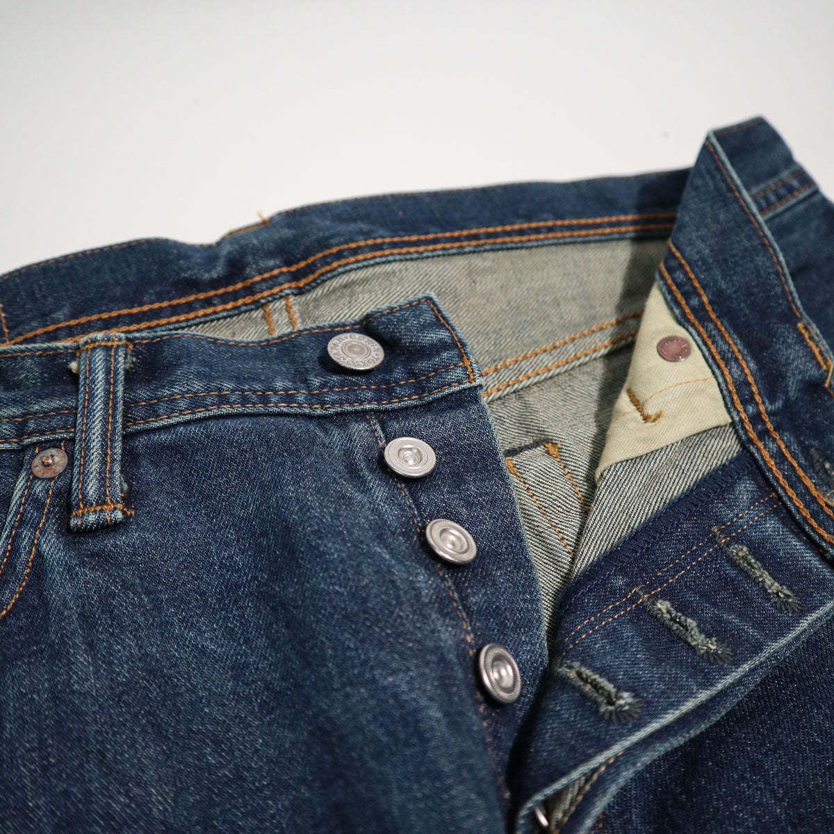"180 Days" is a washed version of EDWIN's 13.5oz Indigo Rainbow Selvedge, intended to showcase an aging pair of raw denim, at the 180 day mark without a wash. Jeans that are washed often fade more evenly and expose more texture, but unwashed jeans like the pair that inspired this wash generate very high contrast fades in which the creases and high wear areas lighten significantly while other areas stay dark blue. EDWIN is proud to have captured the essence of vintage workwear jeans with this wash, calling this wash "truly vintage." This wash is specially produced by using resin treatments to preserve the deep blue, and hand shaving the very high wear areas. High quality, authentic washes such as EDWIN's require special attention and focus, setting these quality washes apart from modern artificial fading processes.
