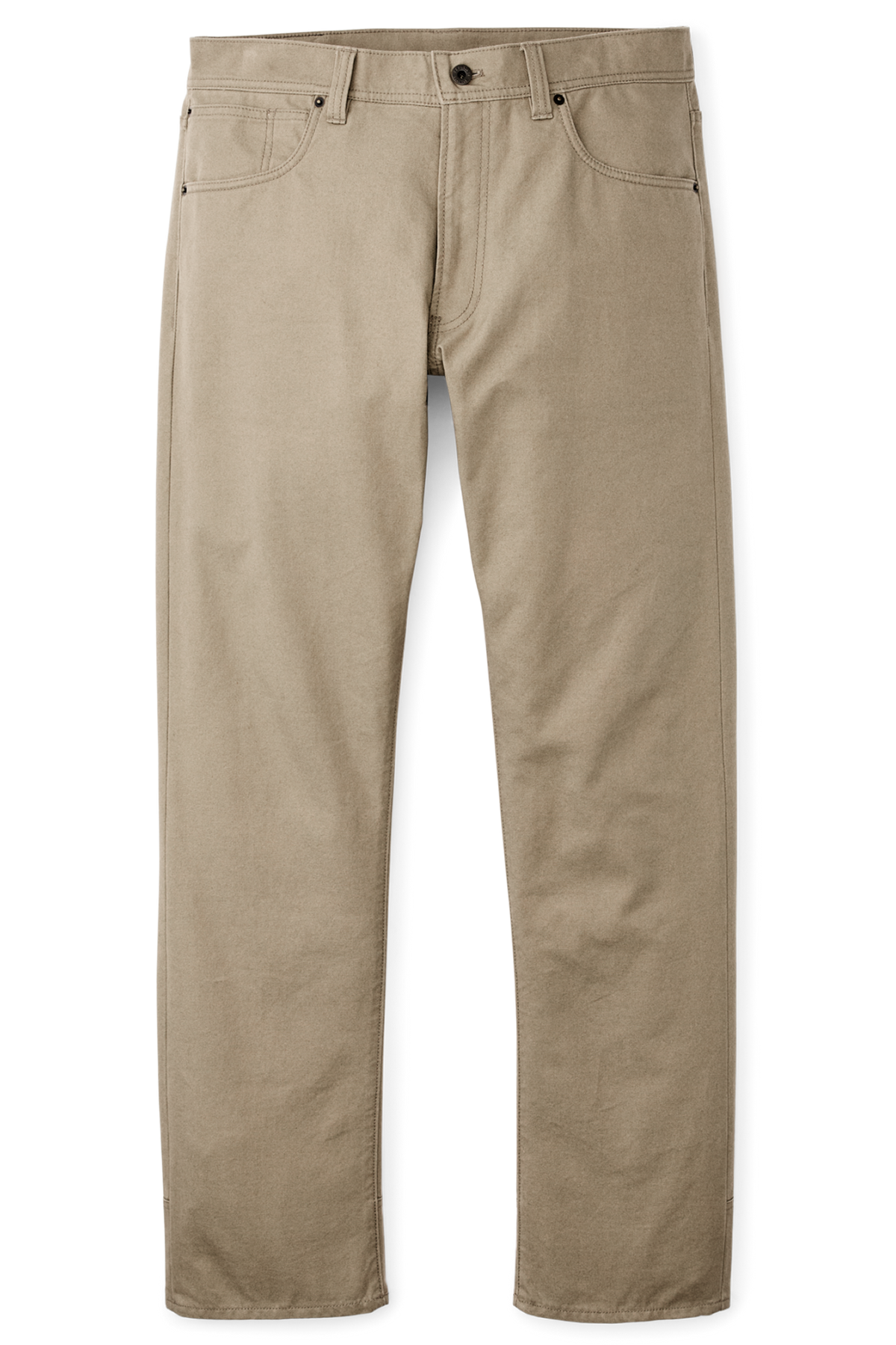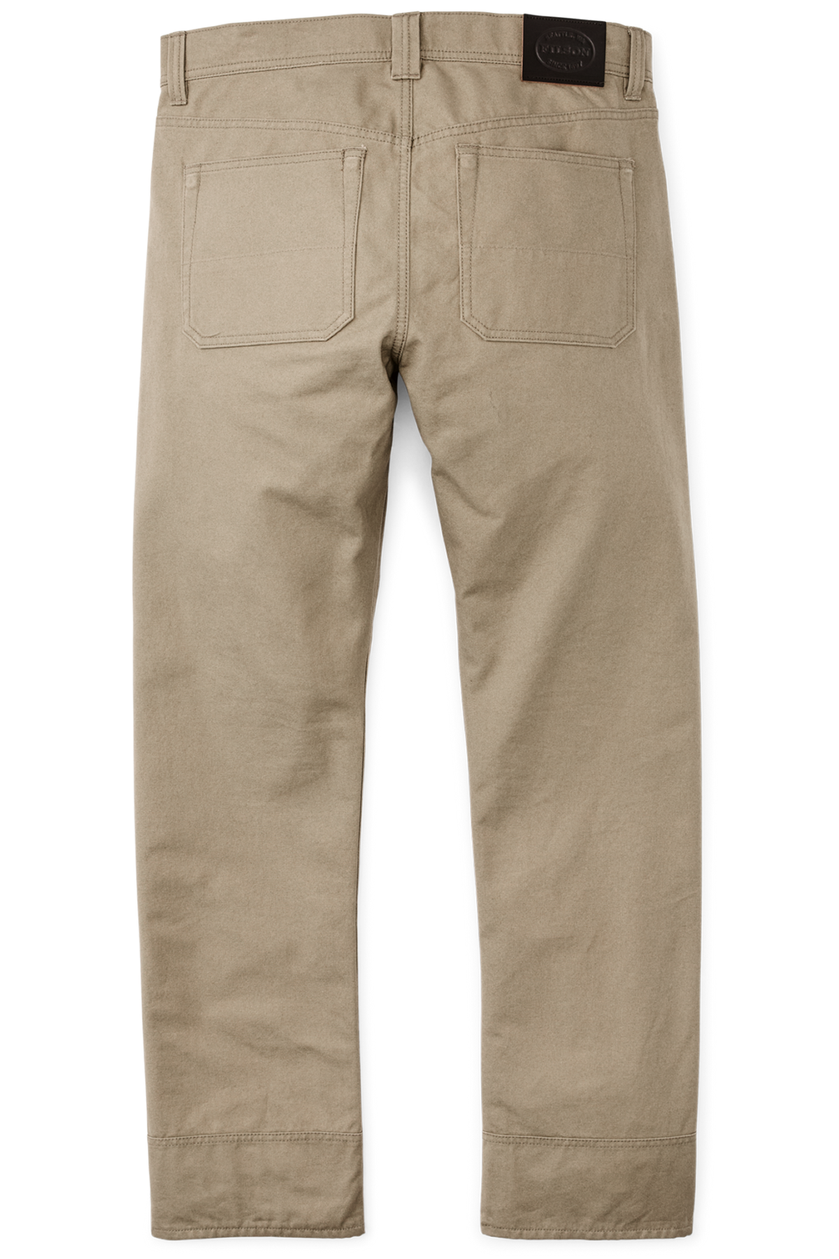 Dry Tin Cloth 5-Pocket Pants are made with the unwaxed version of our iconic canvas that's provided protection from brush, abrasion, and hard use for decades. They're lighter than many jeans, with durability that is unrivaled. Like a good pair of boots, they break in and soften with wear. The leg cut is straight, with room in the thighs for easy movement. A double-layer heel guard adds structure and durability. Zippered fly and snapped waistband. Reinforced pockets.