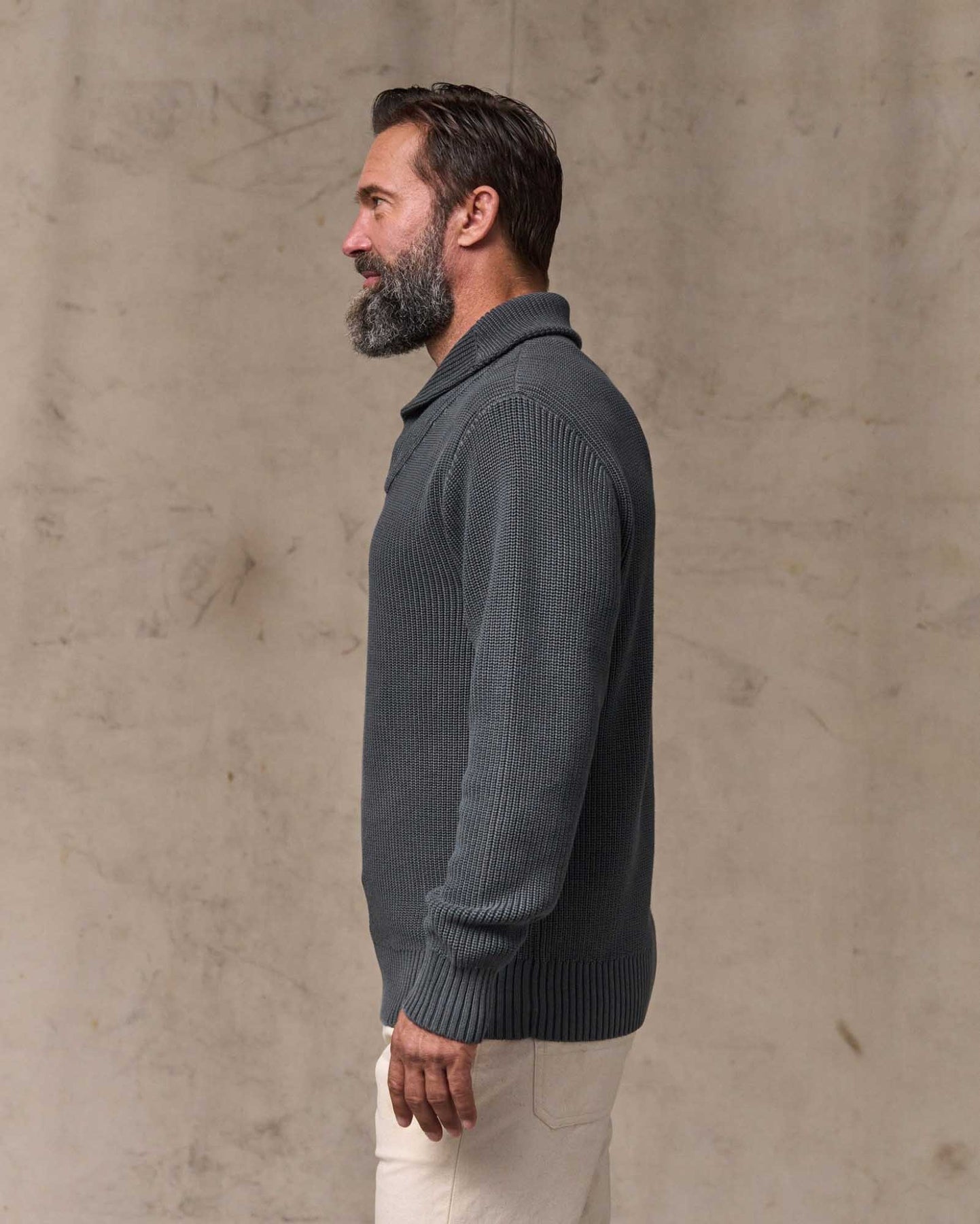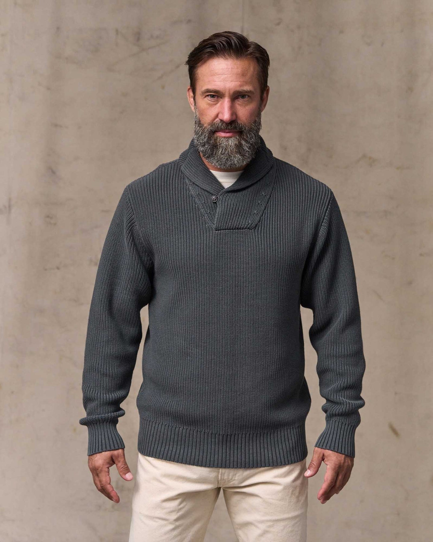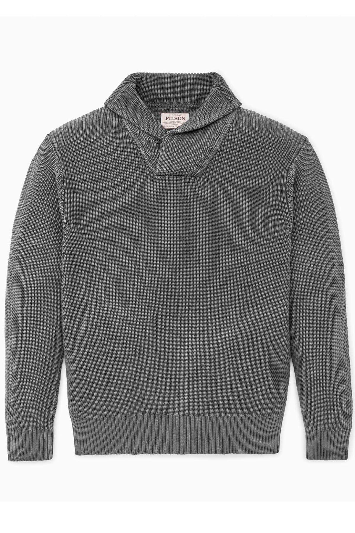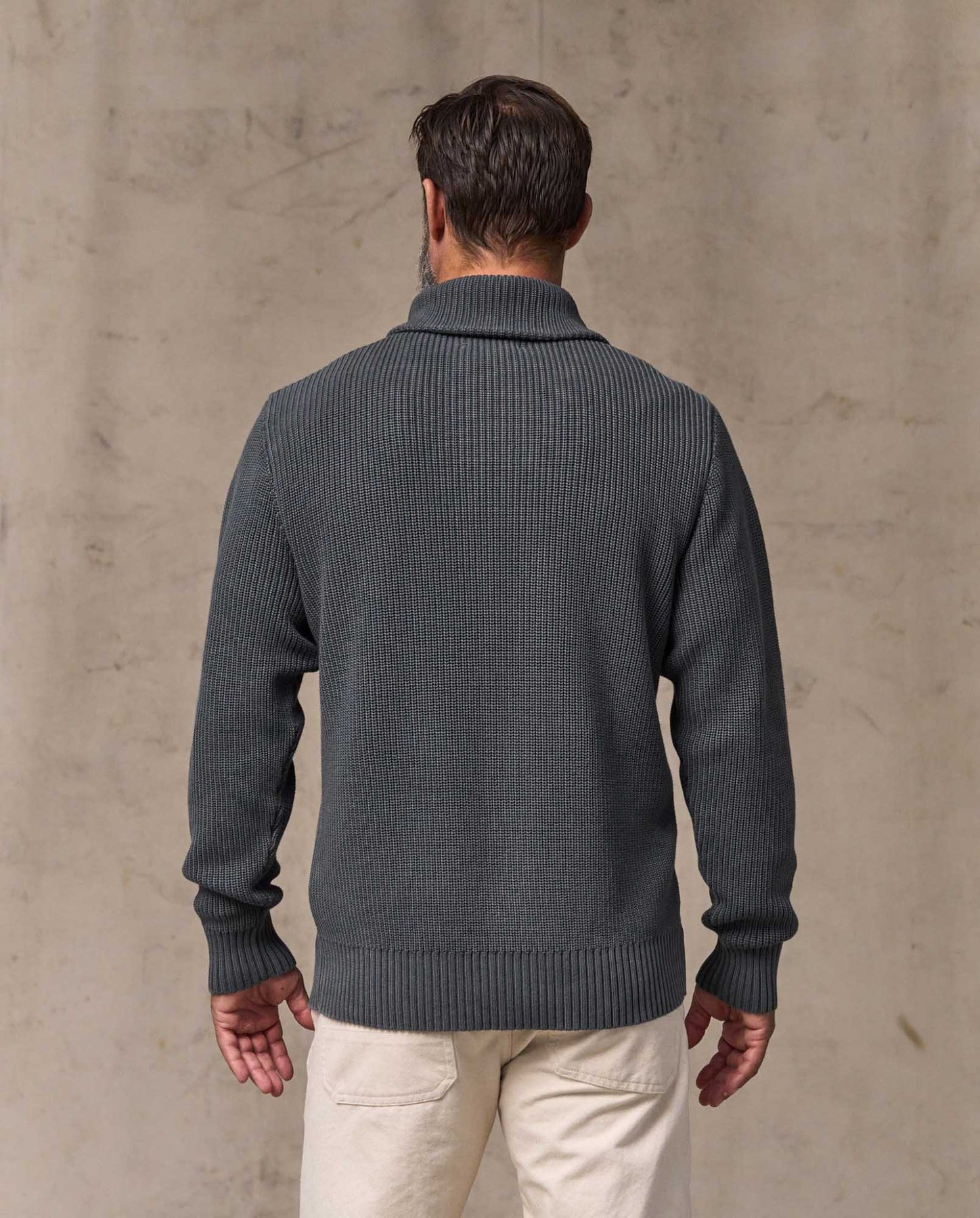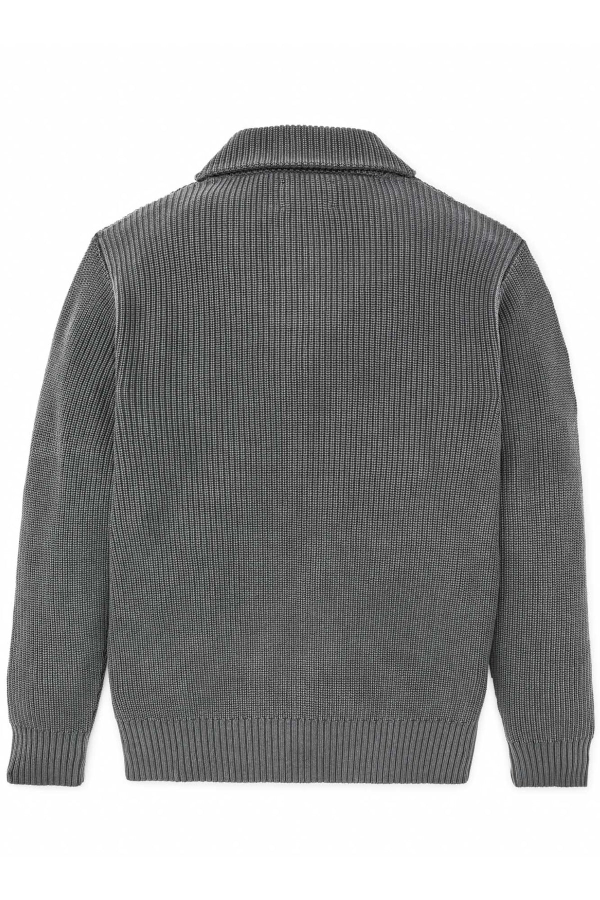 This timeless shawl-neck sweater provides breathable warmth in cooler weather. The shawl-neck collar can be turned up for added warmth at the neck. 7-gauge yarns are knitted with a half-cardigan stitch that's open and flexible. 2x2 rib-knit cuffs and hem. Garment-washed for a broken-in feel from the first day, with a vintage appearance unique to each sweater.