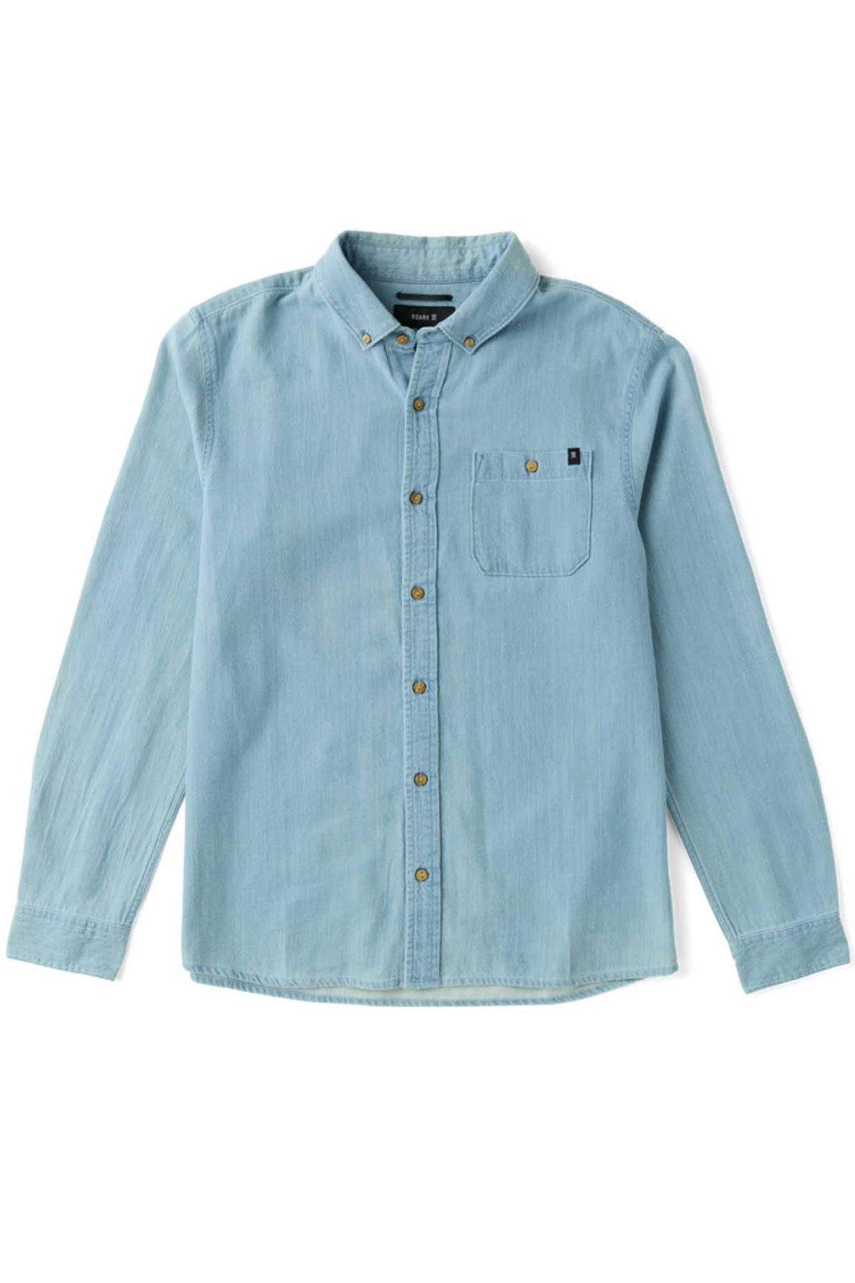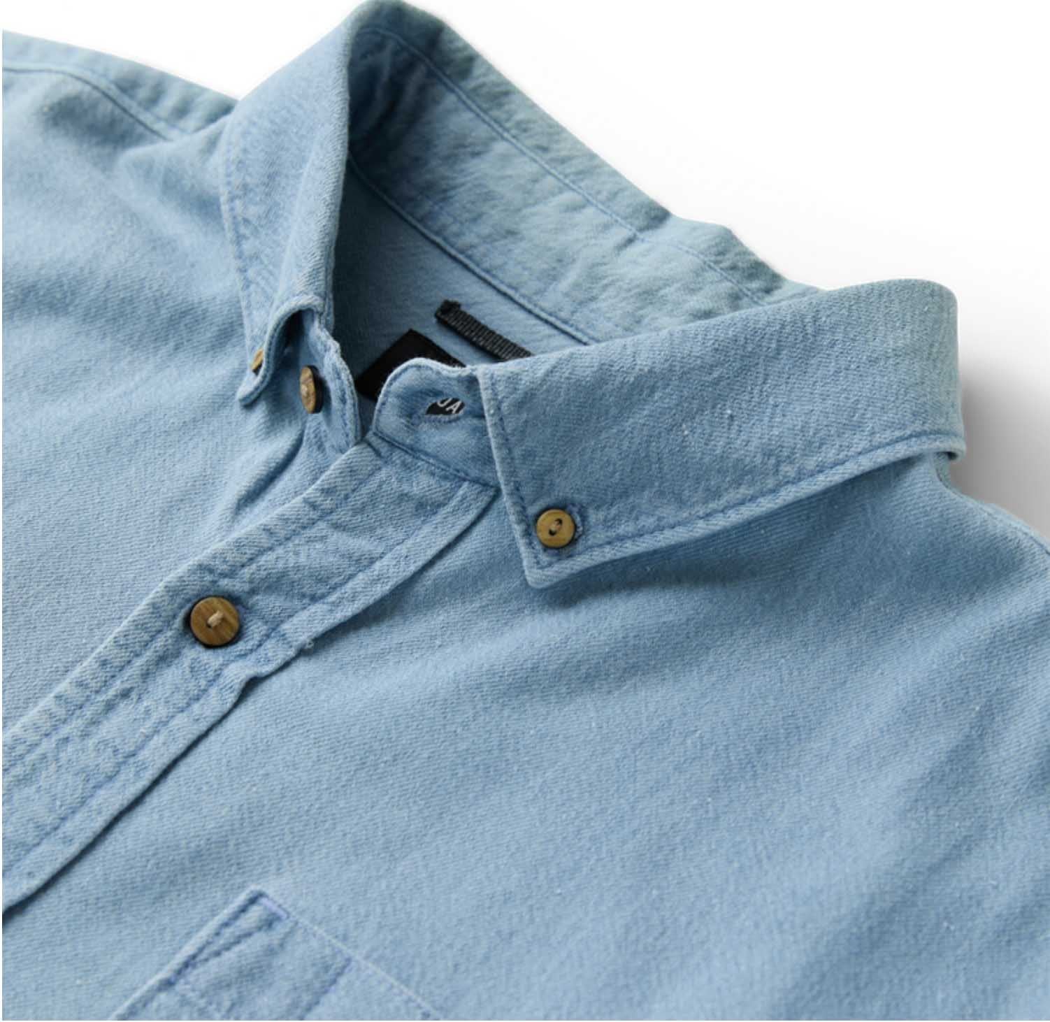Finished in a washed mid-indigo with subtle flecking, it features a button-down collar, chest pocket, and a classic fit that layers easily or holds its own.