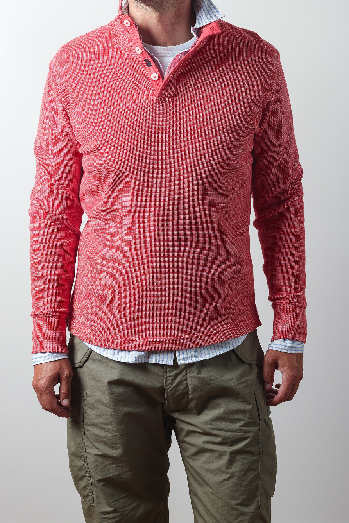 Relwen’s unique 2-color waffle knit now offered in our latest button mock. Shorter stance collar and placket provide a sportier and more casual lightweight look. A modern knit as adept for a run to the gym as an early round of links.