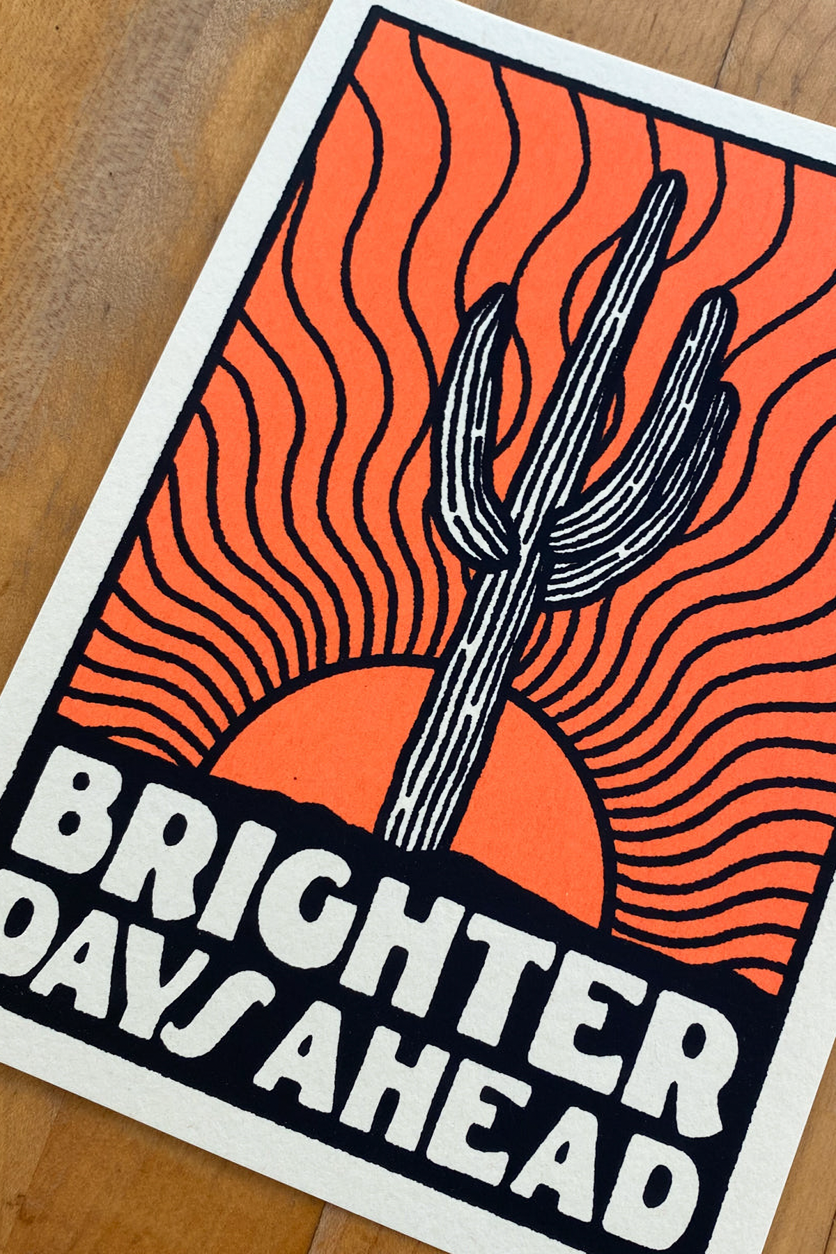 Printed with neon red orange and black ink on cream premium paper.