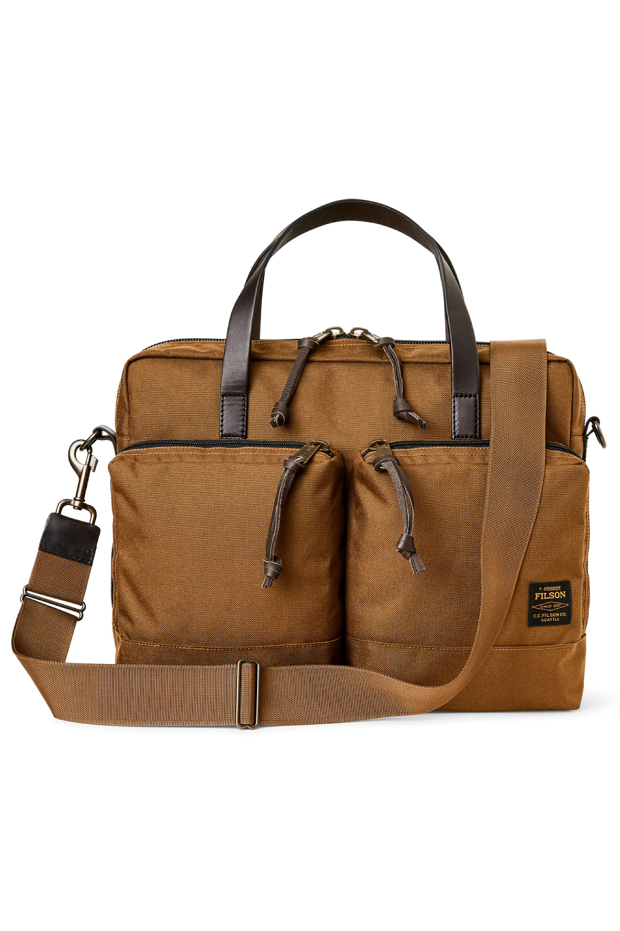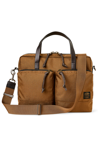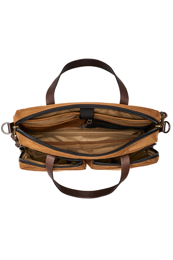 The versatile Dryden Briefcase is made of abrasion-resistant 1000D Cordura® nylon that shrugs off the abuse of daily carry. This fabric is legendary for its ability to withstand abrasion and, sharing the same weave as ballistic nylon, its resistance to punctures and tears is exceptional. A padded sleeve fits laptops up to 16". The trolley strap on the back enables securing the bag over luggage handles. Features large exterior pockets for organizing quick-access essentials. Removable, adjustable shoulder strap.