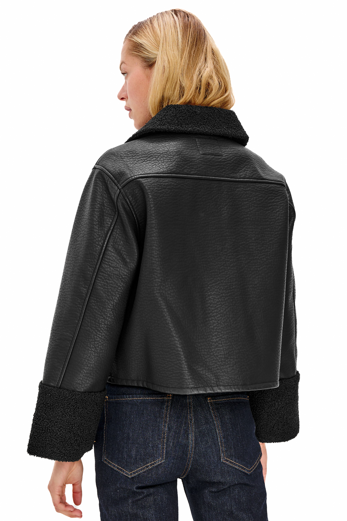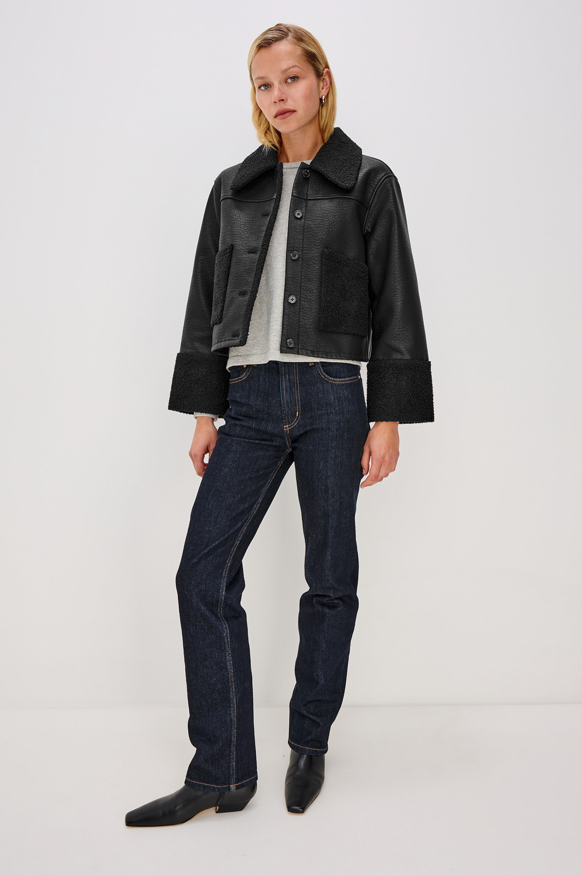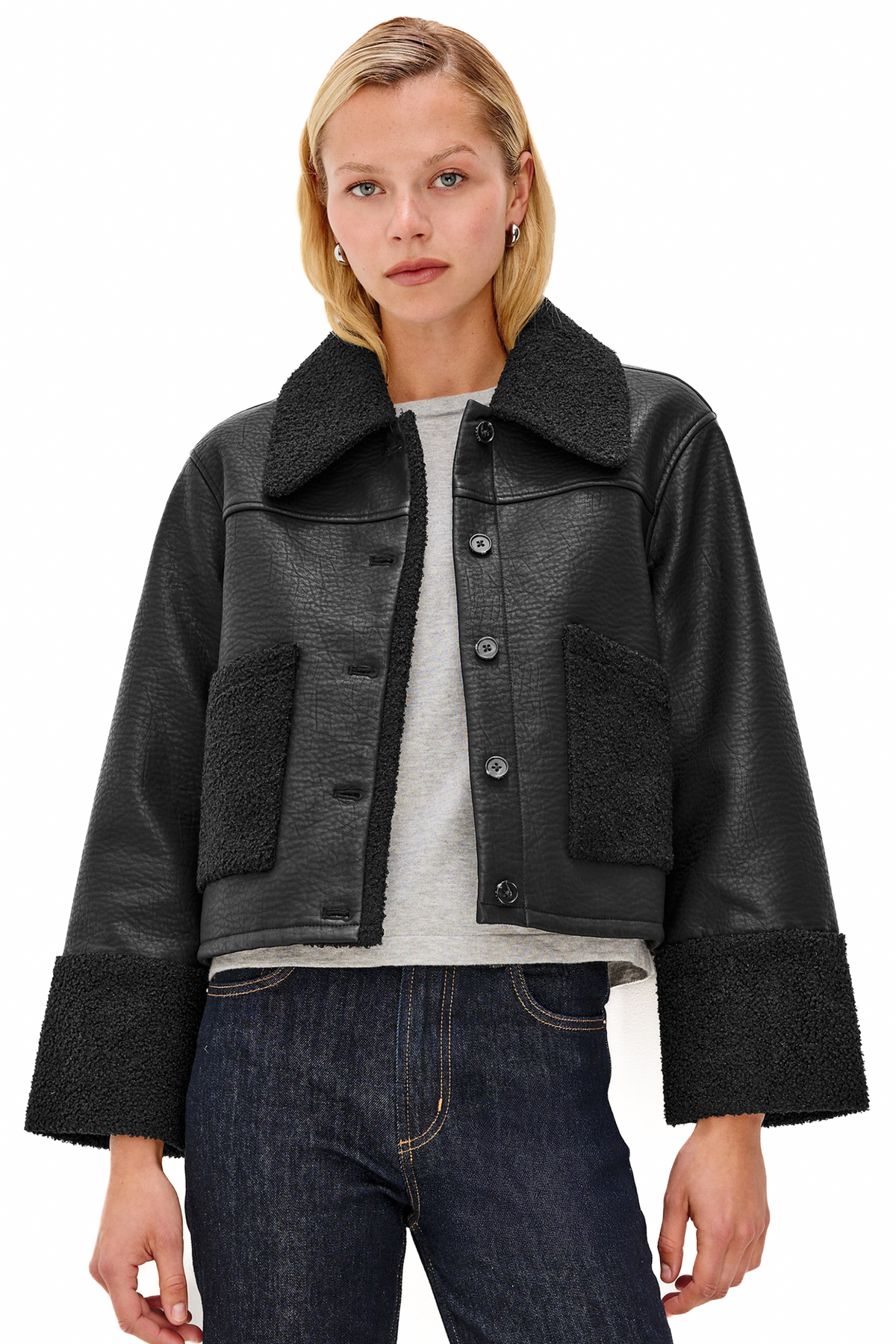 Inspired by the 60s, the Dria Jacket offers a cropped, boxy fit for comfort and style. Luxe faux shearling details the cuffs, collar, and patch pockets, while faux-horn logo buttons add a final touch.