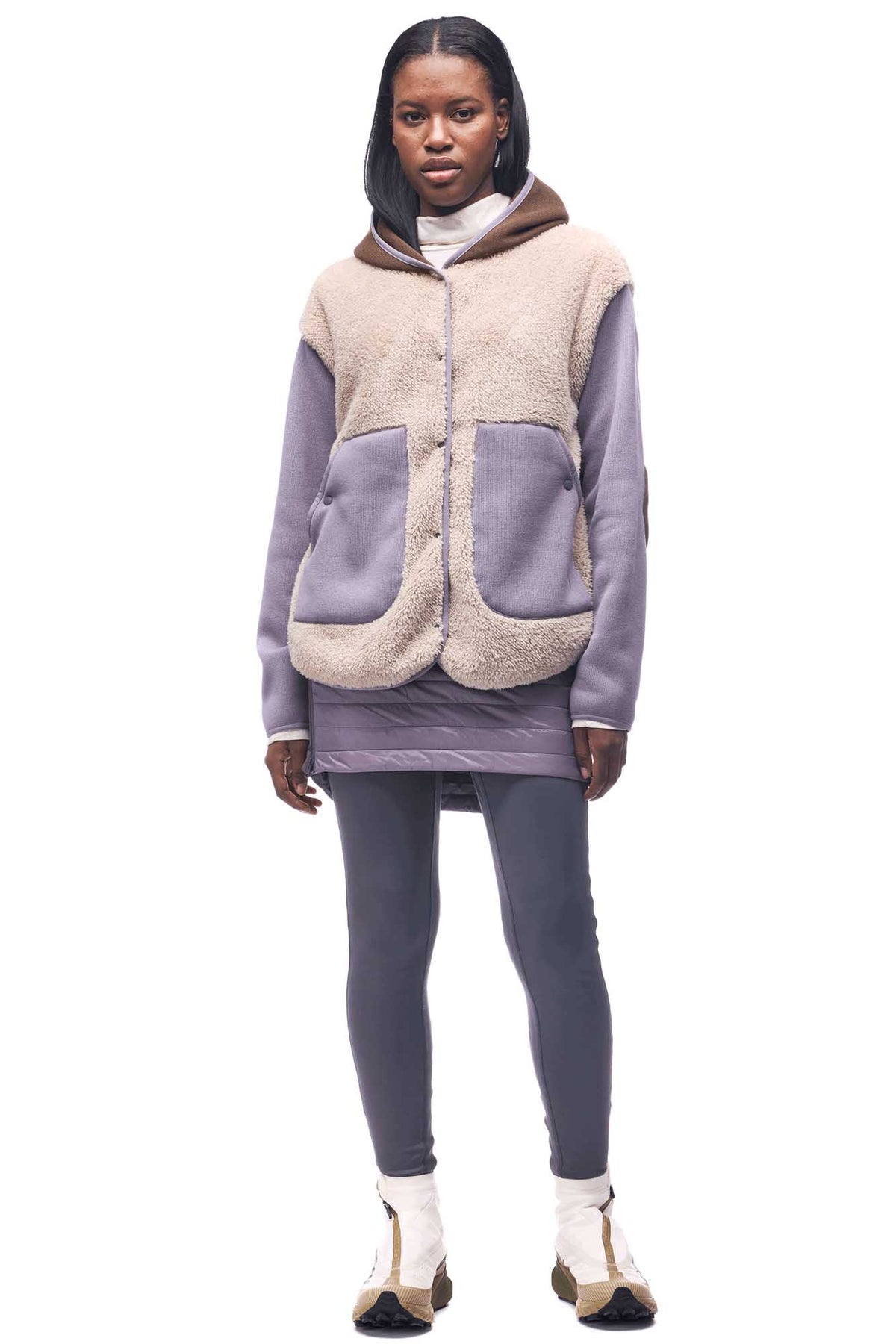 Loose-fit jacket combining Thermal Pro® Polartec® and comfy pile fleece for a blend of textures and performance. Fixed hood, snap-button pockets.
