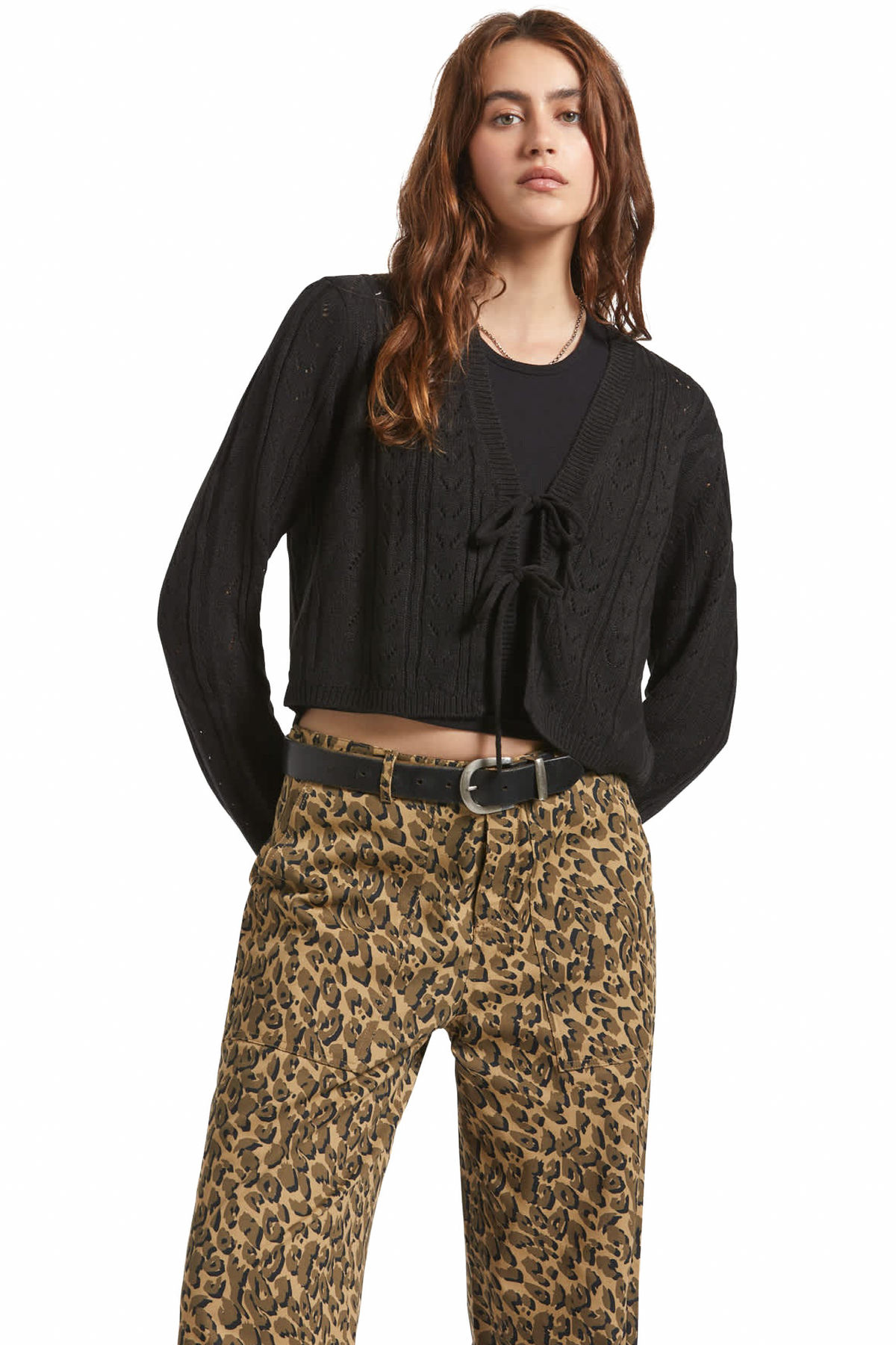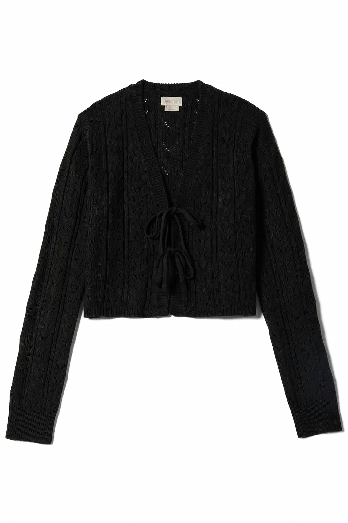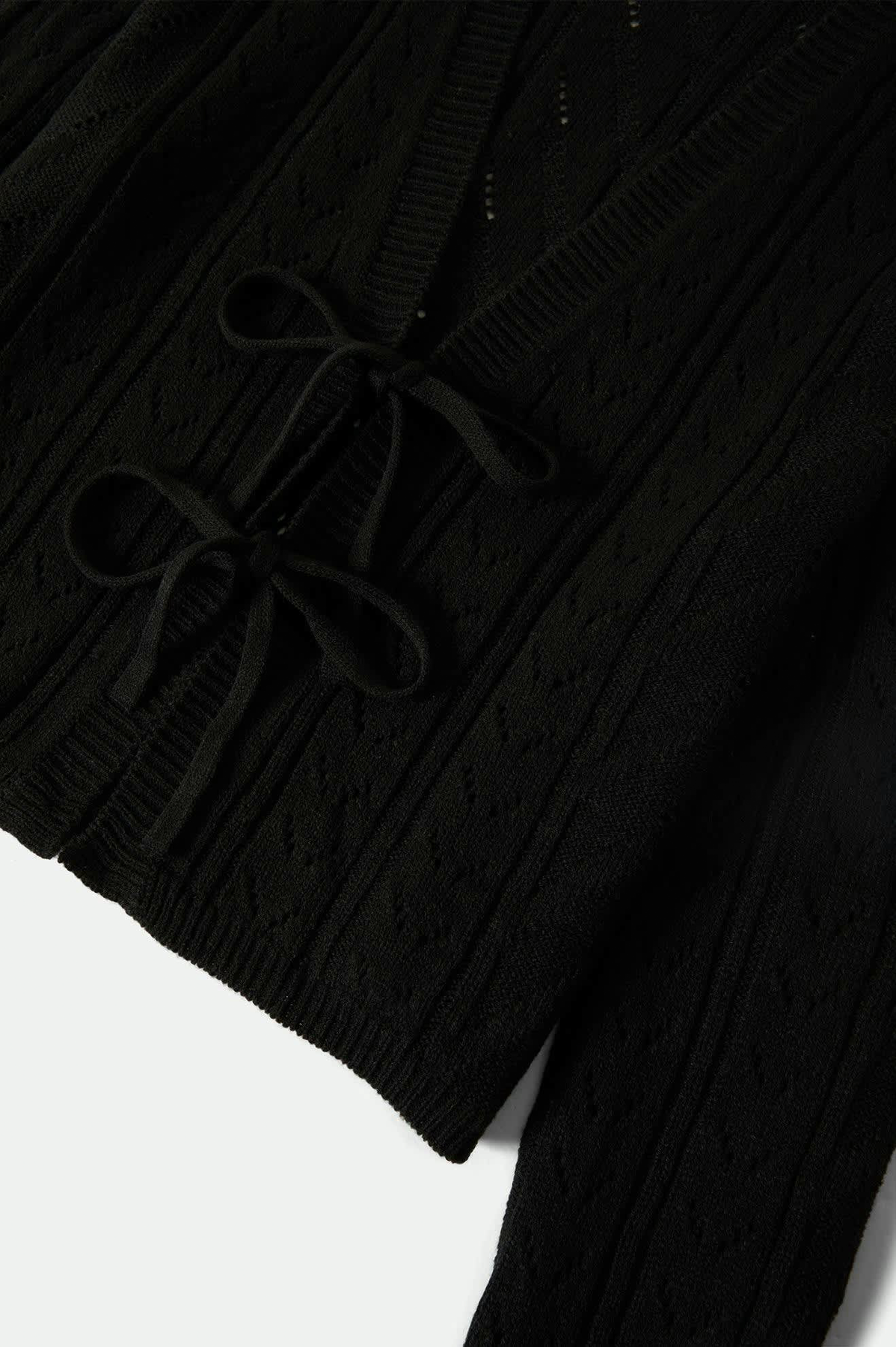A versatile layer for in-between temps. This cropped pointelle cardigan walks the line between lightweight warmth and breathable airiness, with a touch of structure from 1x1 rib knit trim. Two tie closures at the front placket add a stylishly casual vibe, while the long sleeves keep you covered as seasons shift. Pointelle knit fabric in a slim, figure-skimming fit makes it easy to layer over a dress for the office or a cami for weekend brunch.
