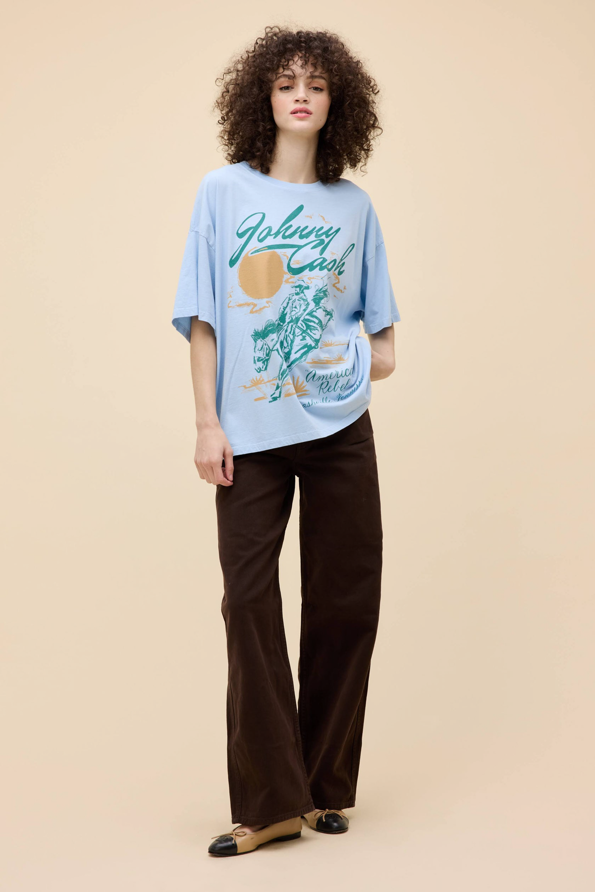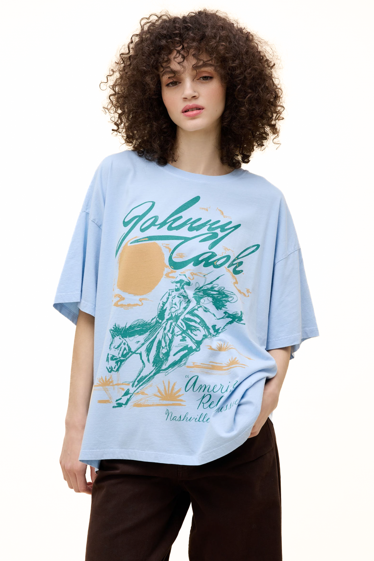 Bound to be a best seller, the epic artist Johnny Cash hits this OS Tee featuring a bucking horse graphic inspired by his country roots and a quick mention of "American Rebel," the documentary celebrating the Man In Black through his 12 greatest hits.