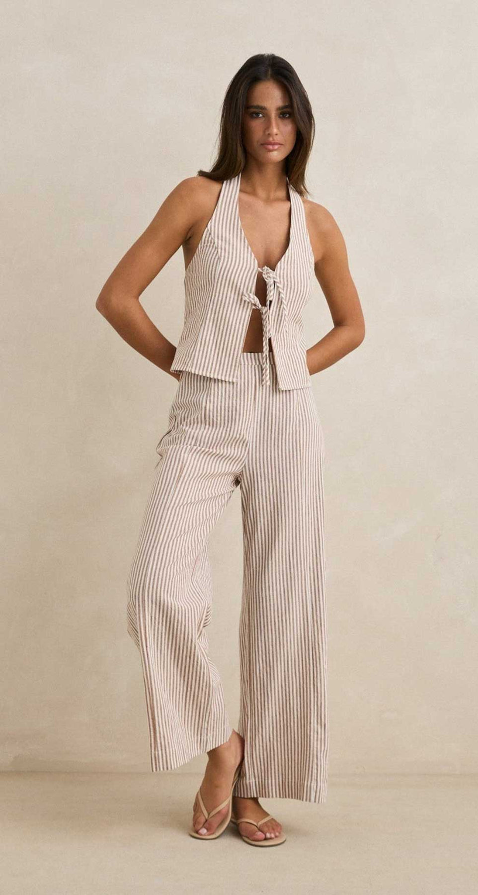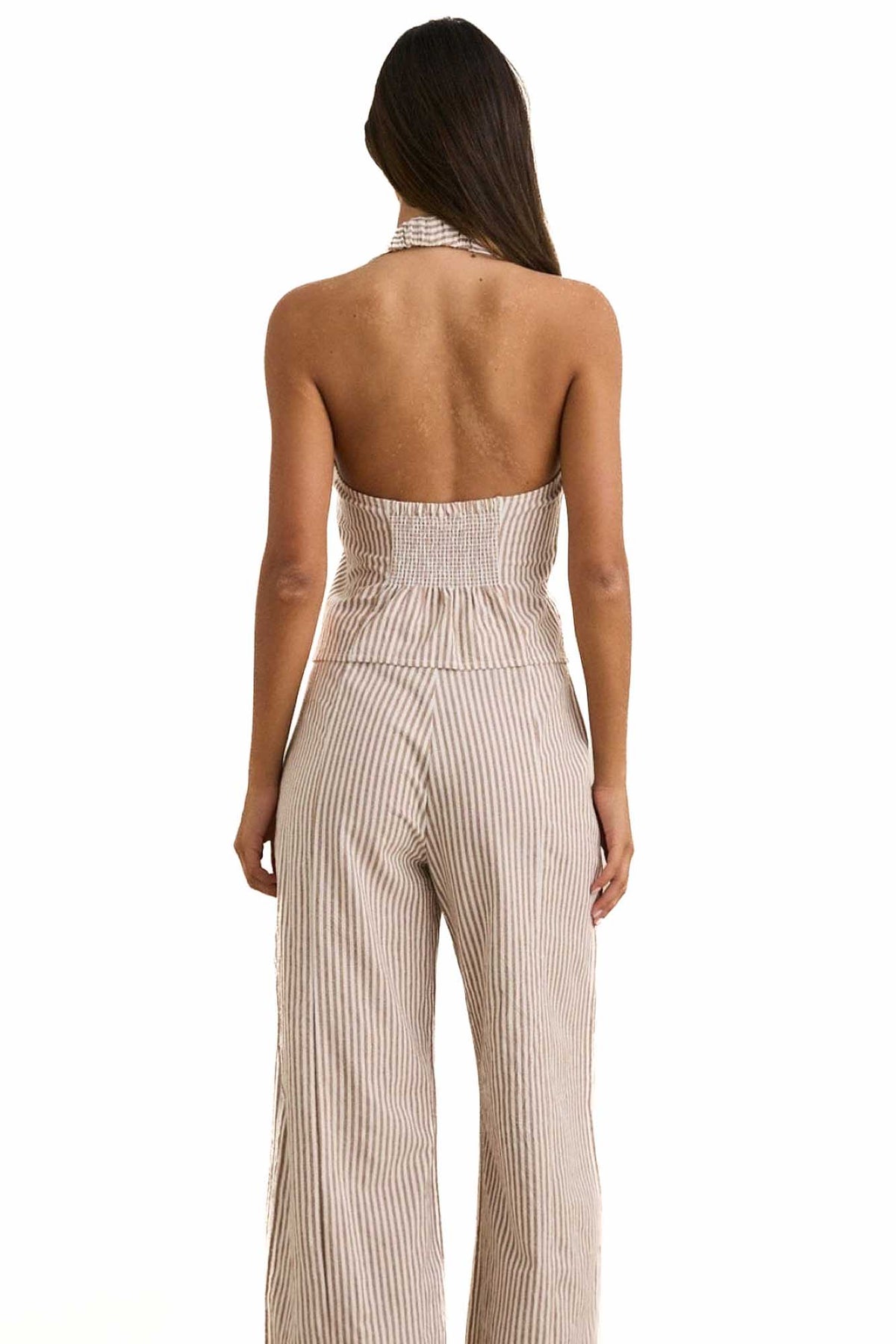 The Louise Tie Front Halter Top in Tan features a slim fit with dual adjustable front ties and a smocked back panel for a flexible fit. Halter button closure with two sizing options ensures added comfort.