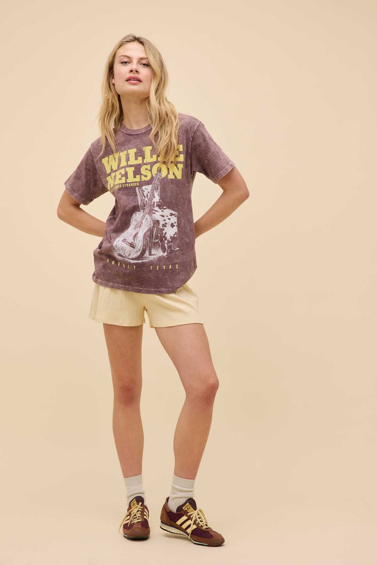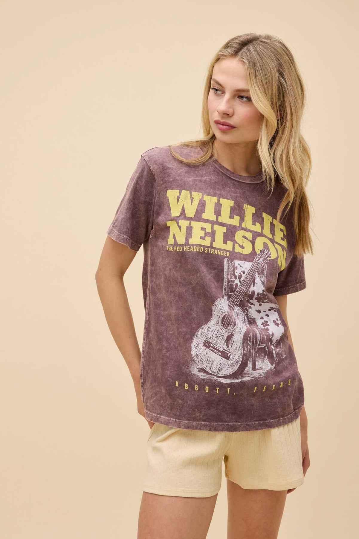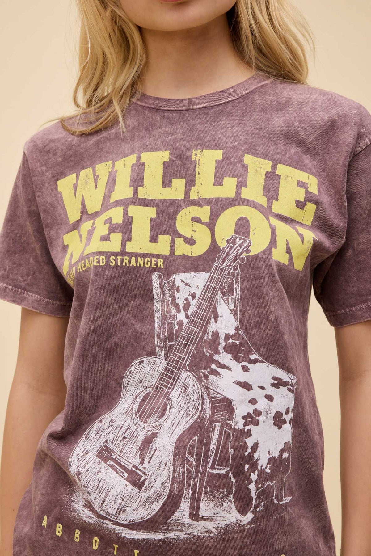 Willie Nelson - the living legend hailing from Abbott, Texas hits this acid wash Weekend Tee shouting out his breakthrough album, Red Headed Stranger. Featuring Nelson's tool of the trade he named Trigger, a guitar graphic hits center chest with cow hide to accent this double-sided souvenir.