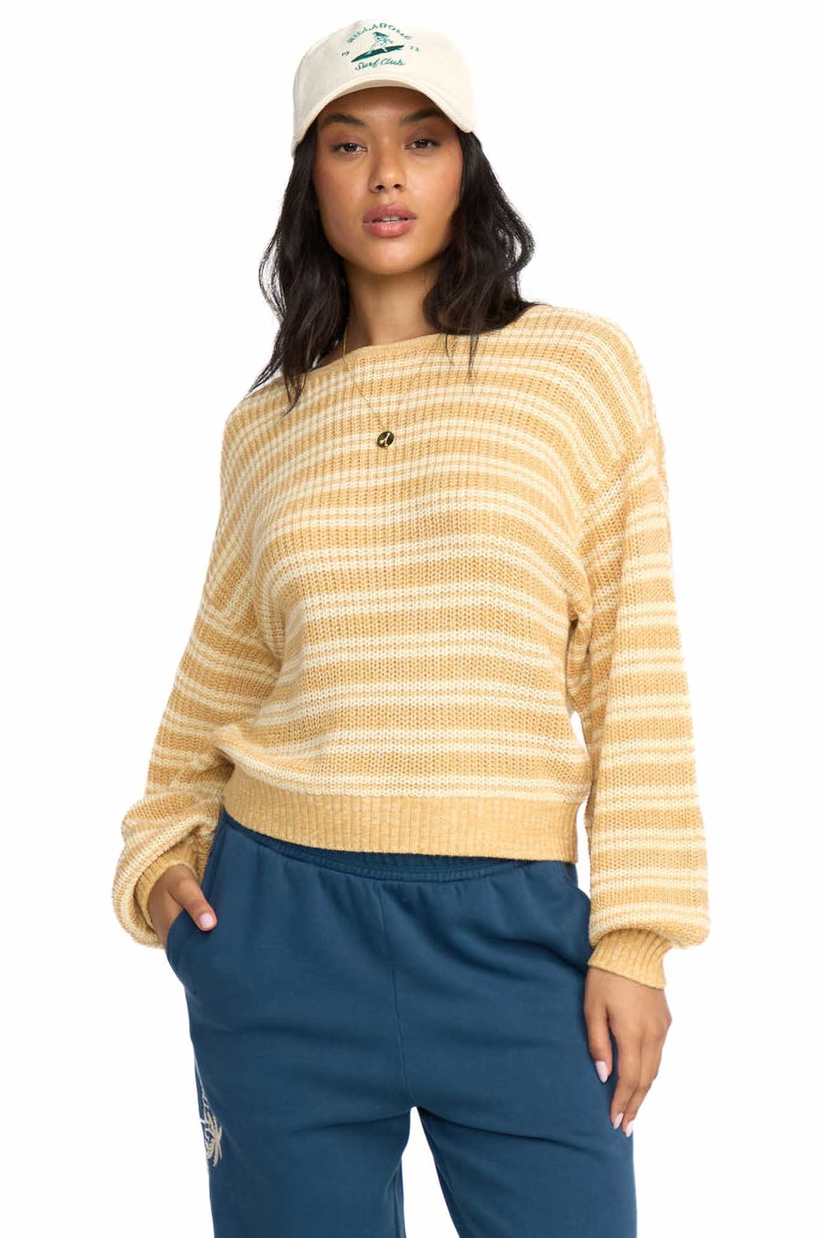 Cotton-blend sweater brings easy style with its relaxed fit and graceful scoop neckline. A subtle metal plate detail adds the perfect finishing touch to this laid-back essential. Featured here in the Yellow colorway.