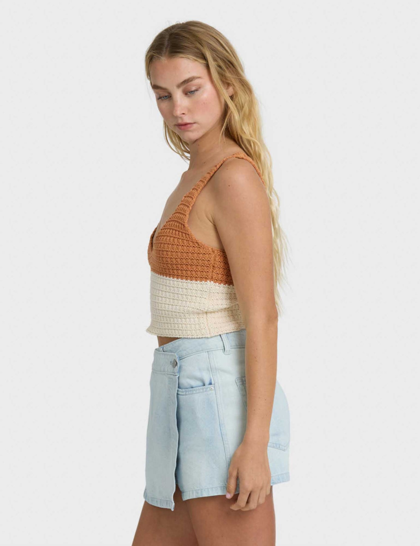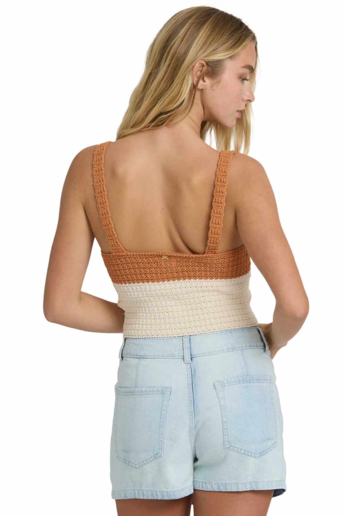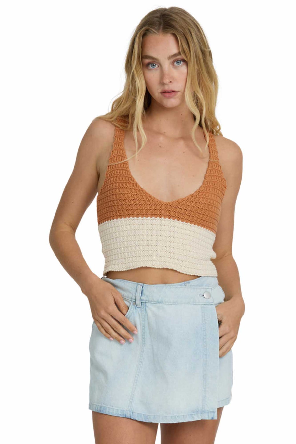 Anders Sweater Tank combines comfort with style in a fitted silhouette. Made from 100% cotton novelty stitch, this color block tank features a flattering v-neckline and premium metal plate detail. Perfect for pairing with denim or layering under jackets when temperatures drop.