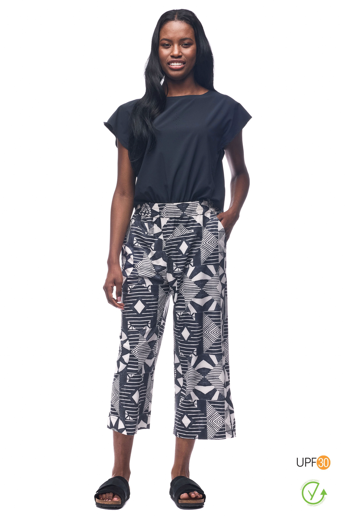 A lightweight cropped pant with a comfortable waist and wide leg.