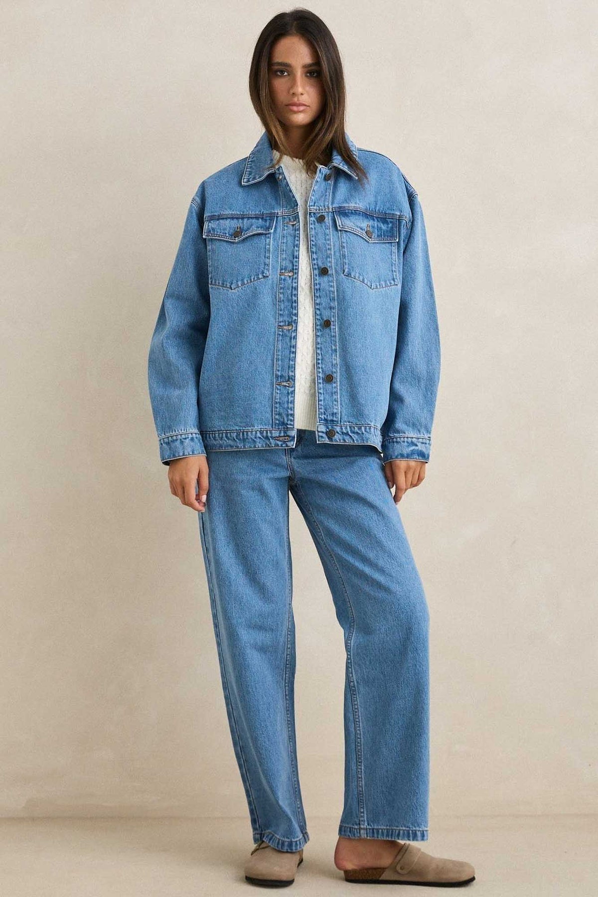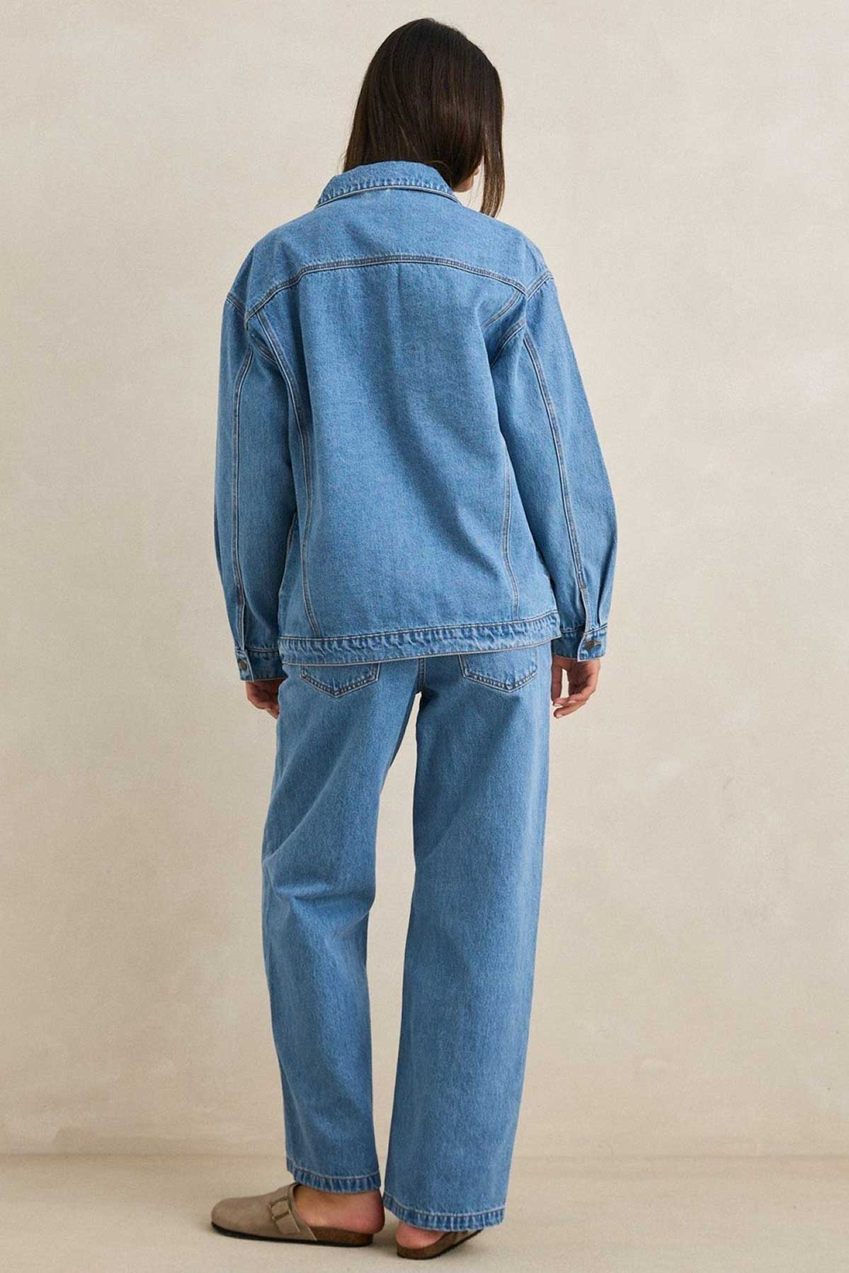 A timeless layer, the Essential Denim Jacket in Worn Indigo features an oversized fit with dropped shoulders and flap chest pockets. Finished with metal shank buttons and vintage wash detailing.