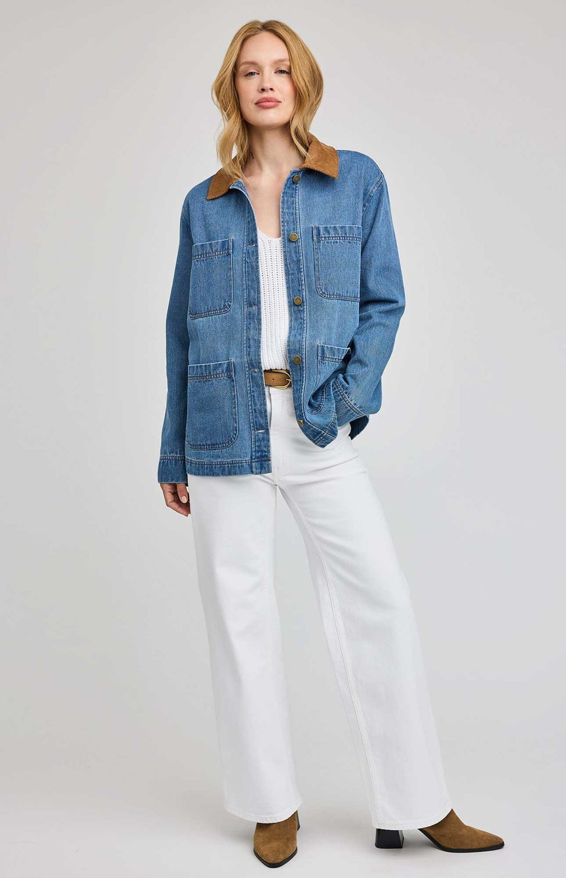 The Flynn jacket is made of a heavy weight denim fabric that has been specially washed for a perfectly lived-in look. The effortless silhouette features patch pockets and a contrast corduroy collar.