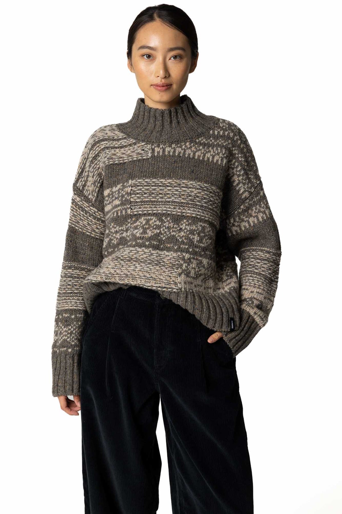 Cut in a relaxed, boxy fit, this sweater is made for the colder months, whether hunkering down at home or wrapping up to brave the elements. The flecked wool and alpaca blend yarn combines a rustic look with incredible softness, enhanced by the snug high neck. A new spin on a time-honoured classic, discover a sweater you'll be reaching for again and again.