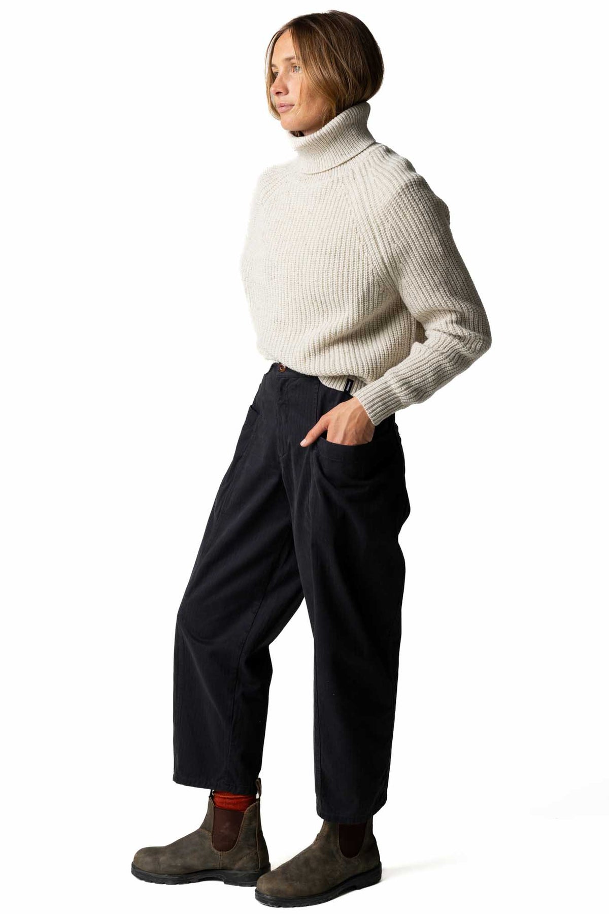 The Mora Roll Neck Knit Sweater is our modern take on a fisherman knit, with an extra warm high neck.
