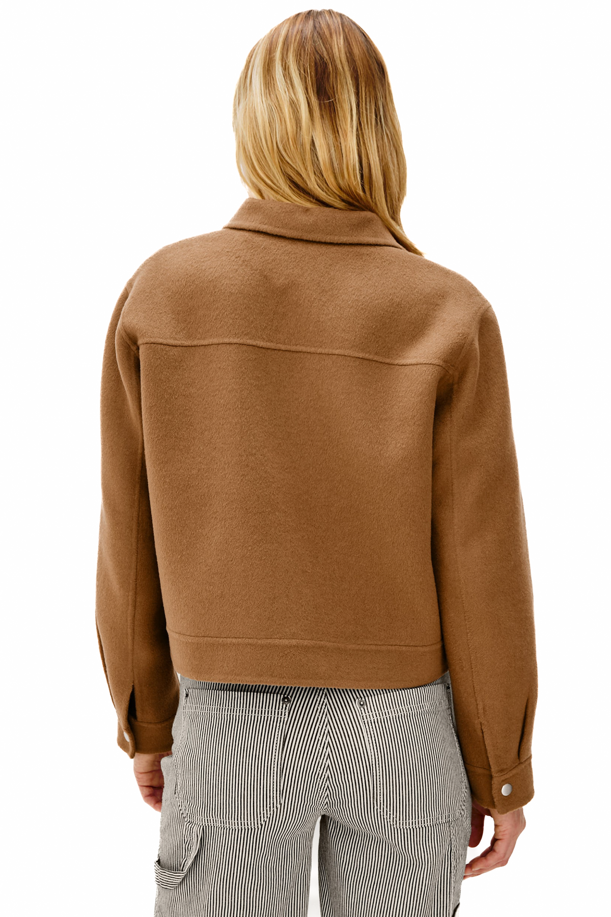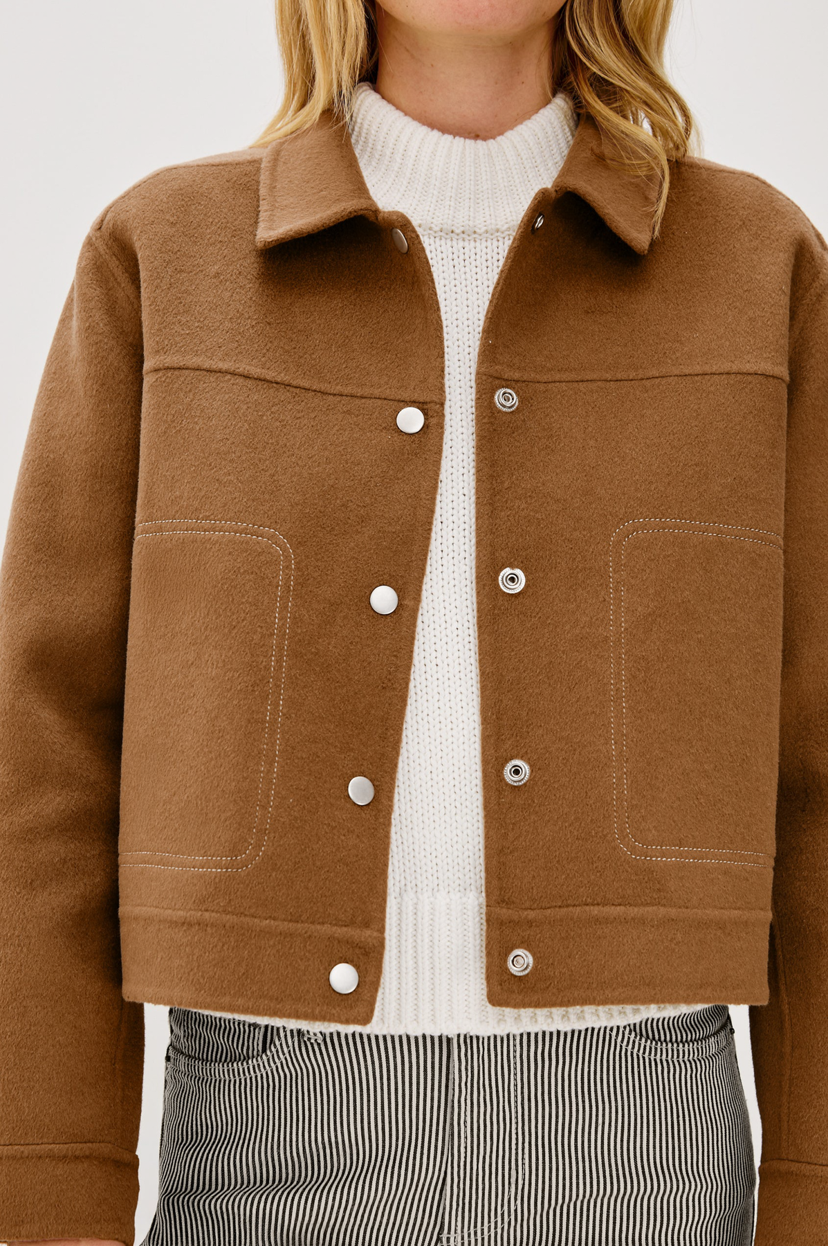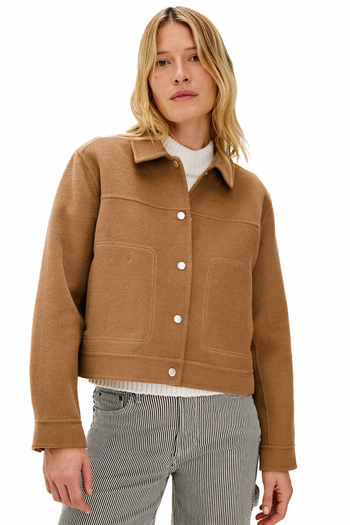 The Mountain Jacket is made from a heavy wool blend with a boxy fit and exposed stitching. Yoke details and structured lines lend it an adventurous feel.