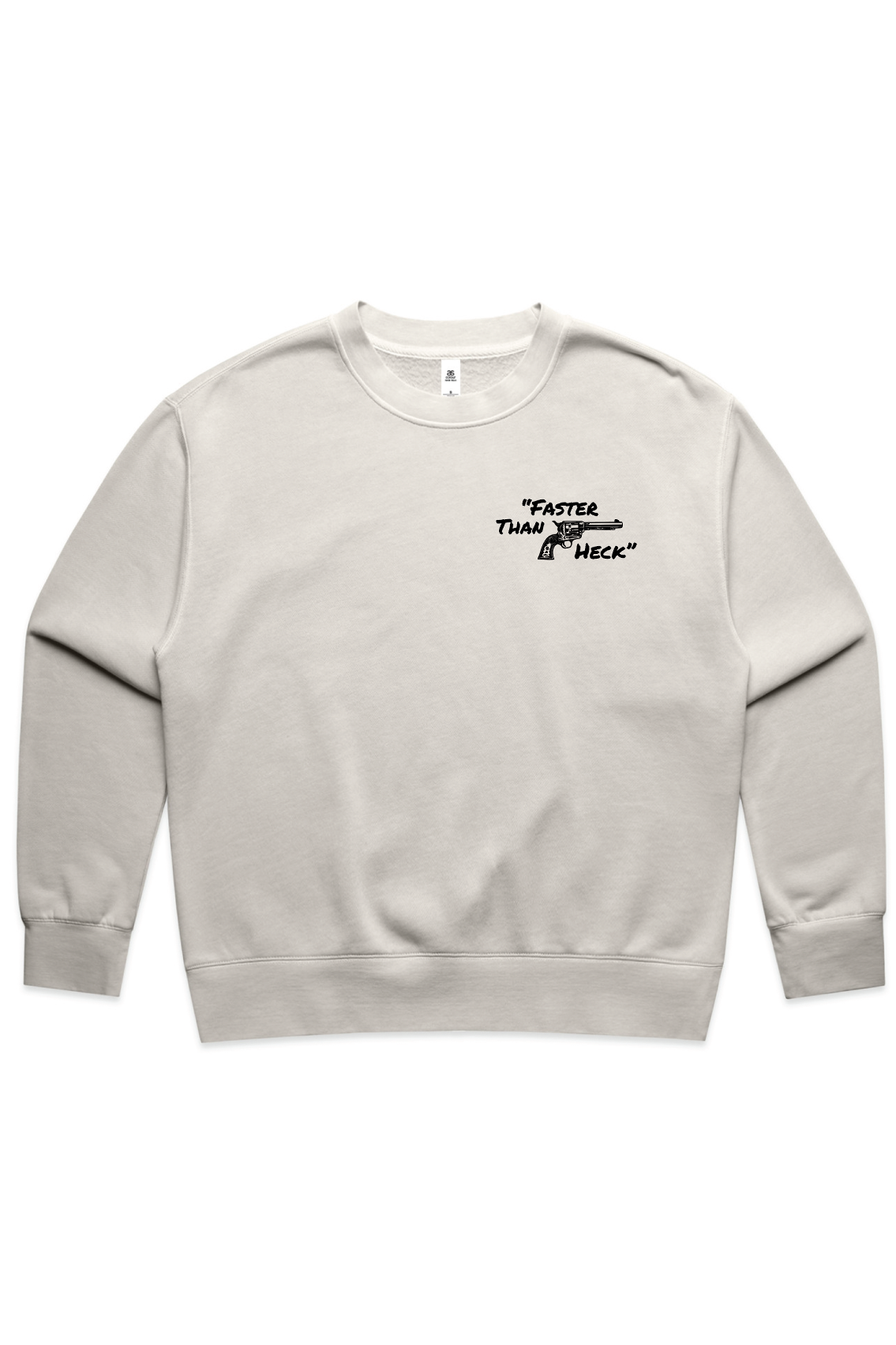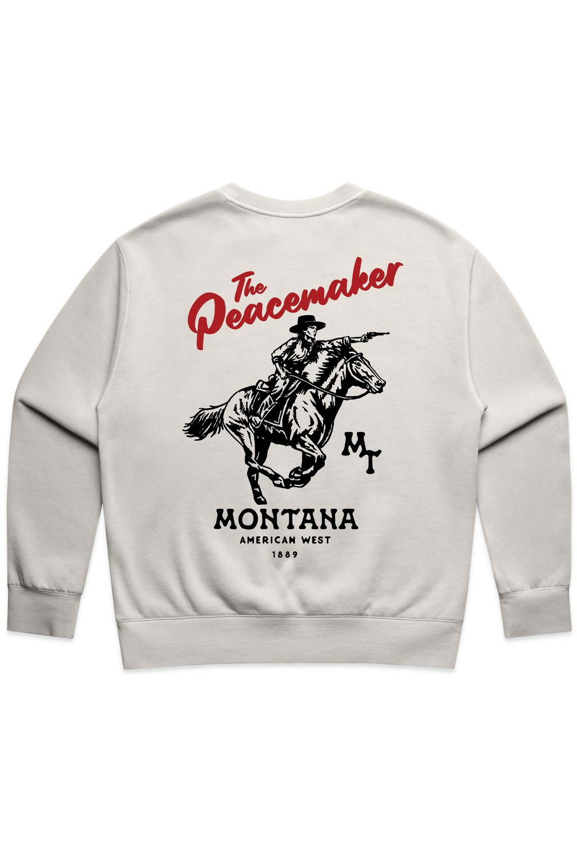 Screen-printed on a relaxed garment dyed women's crewneck sweatshirt in Bozeman, Montana.