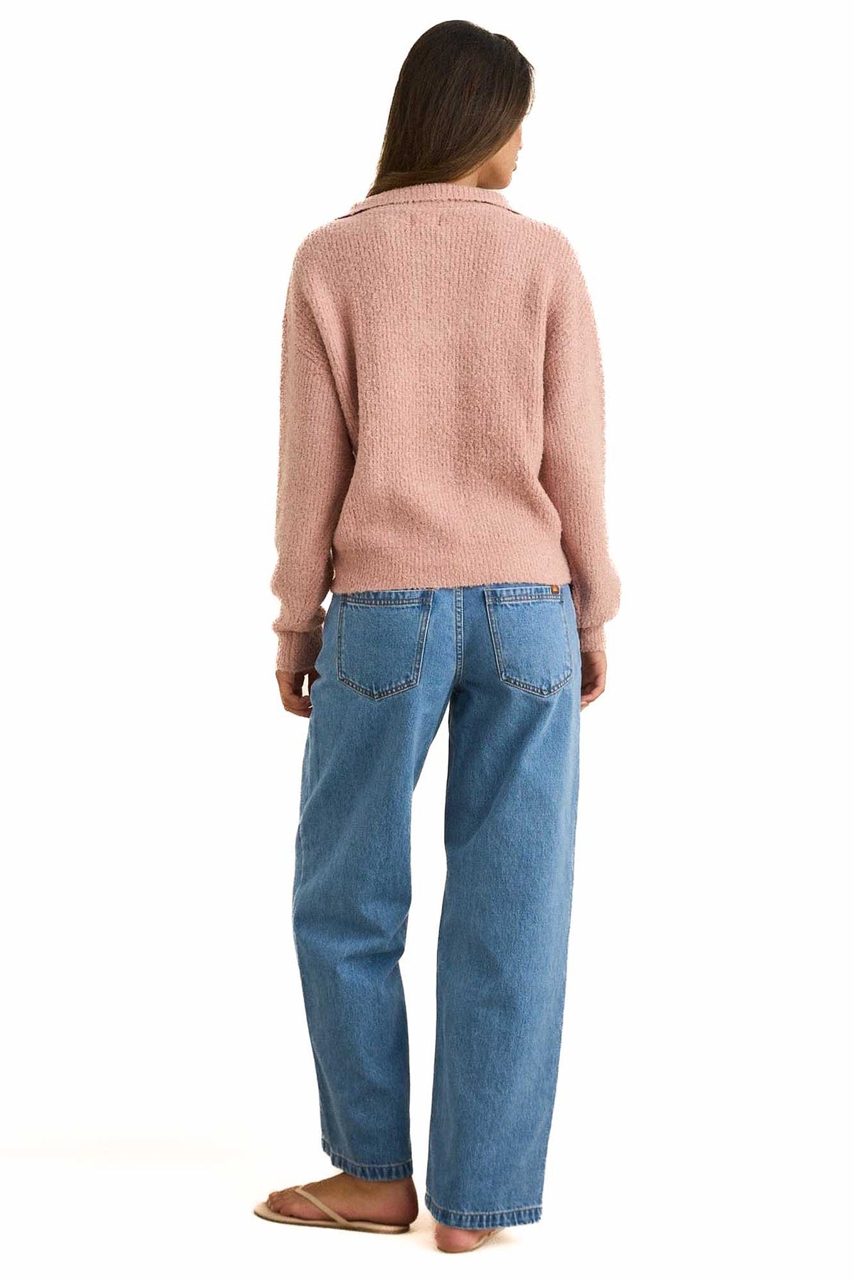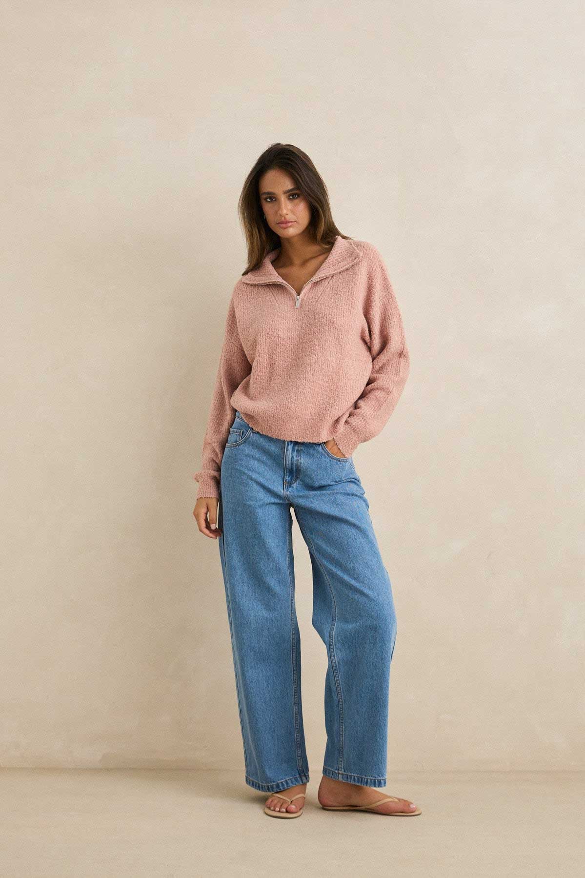A cozy statement piece, the Quinn Zip Knit in Pink features a cropped relaxed fit and quarter zip collar. Soft boucle-like texture adds warmth and vintage coastal charm.