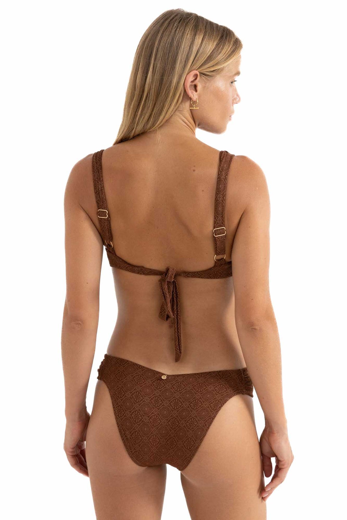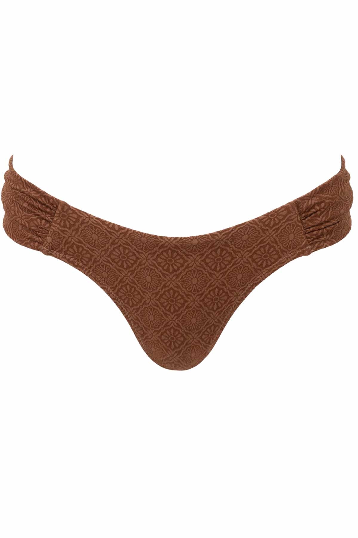 Moderate bottom coverage is offered by the Sunset Soft Side Holiday Pant in Chocolate, featuring a mid-rise waist with wide soft side seam panels and gathers for a flattering fit. It has a clean finished waistband edge and zig zag stitch at front and back leg opening, along with a metal coin logo.