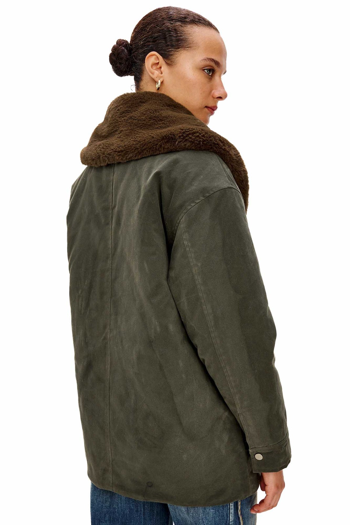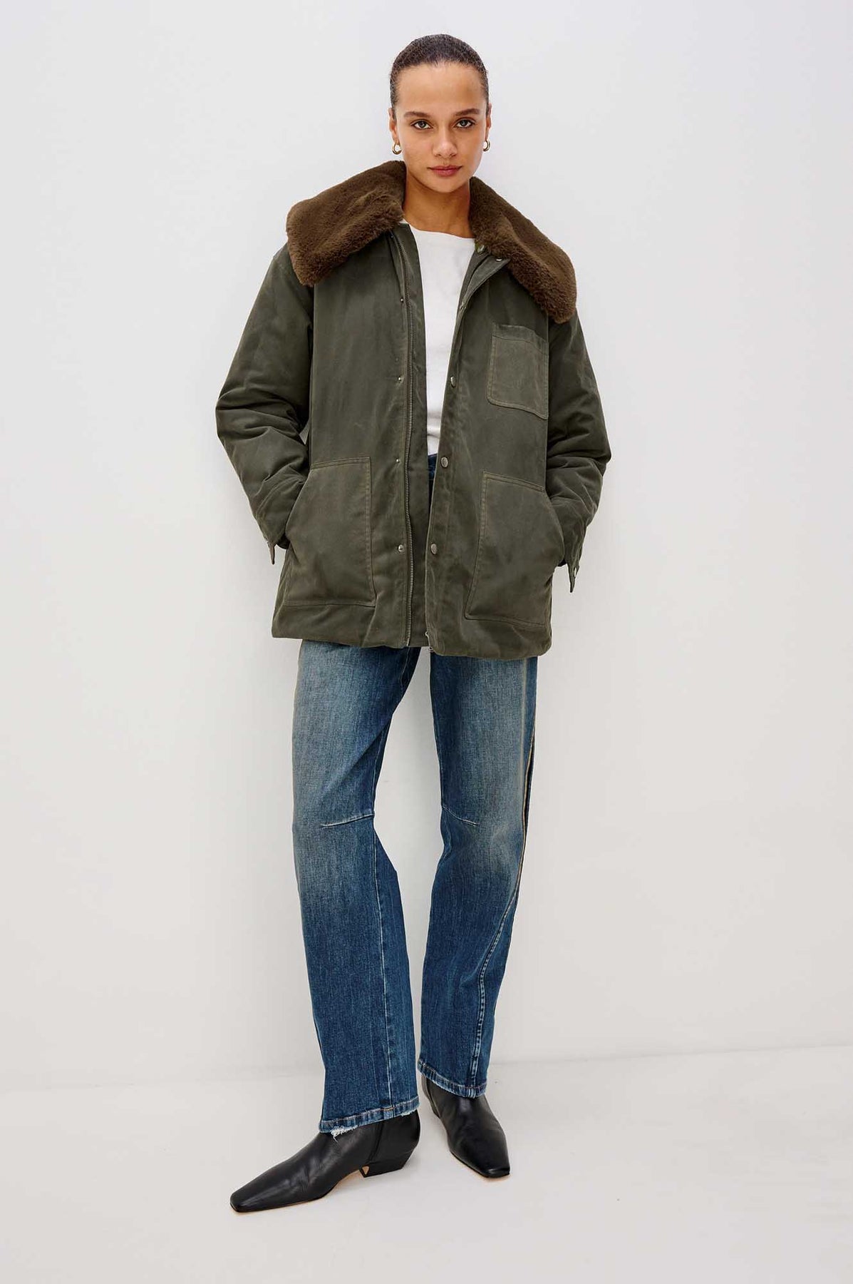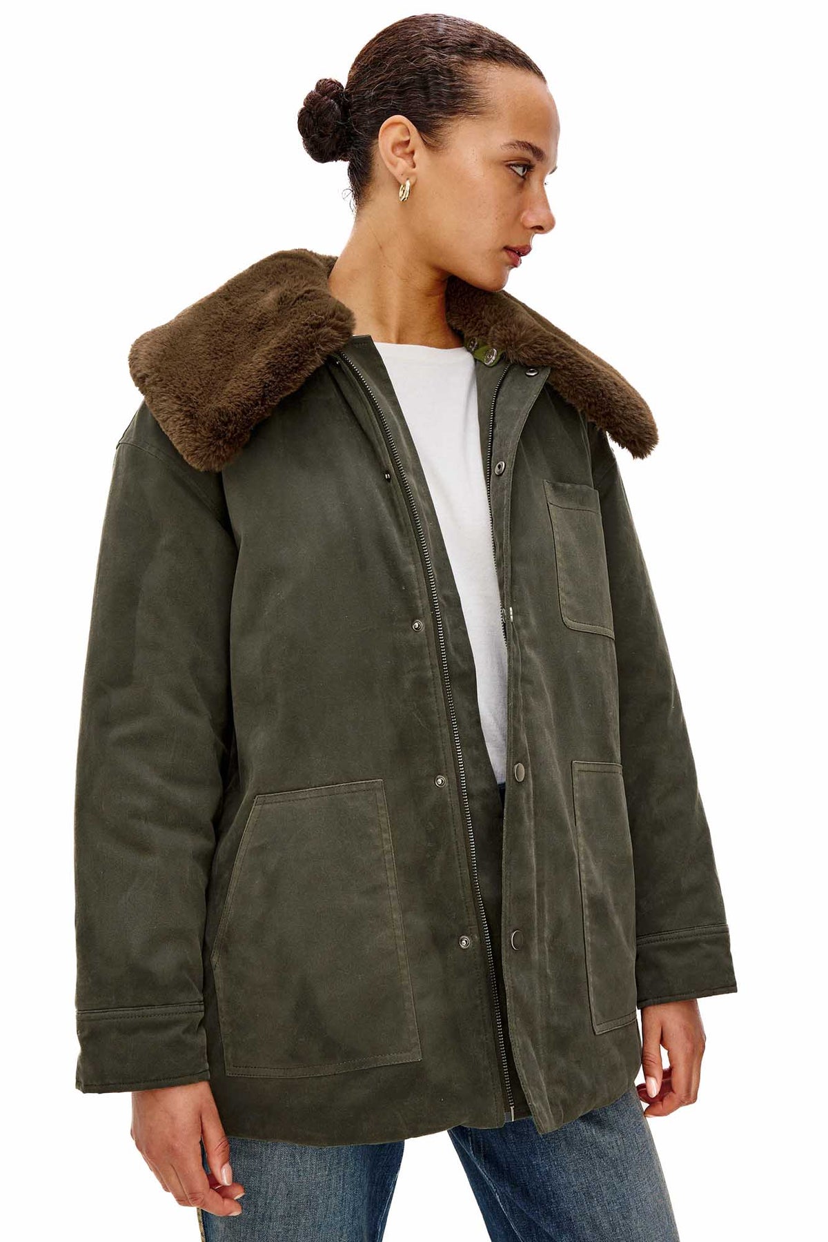 Workwear-inspired and exceptionally warm, the Tessuto is designed in waxed cotton canvas with subtle texture. This outerwear essential features a removable vegan-fur collar, front zipper with snap closures, lightly quilted interior, chest patch pocket, and side pockets for functional style.