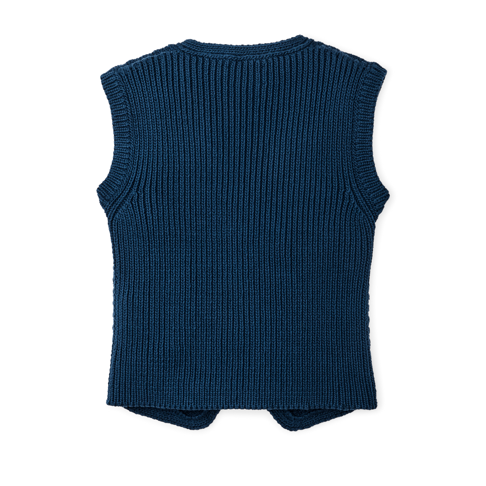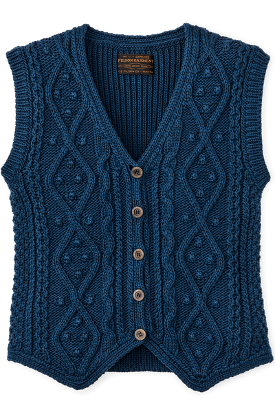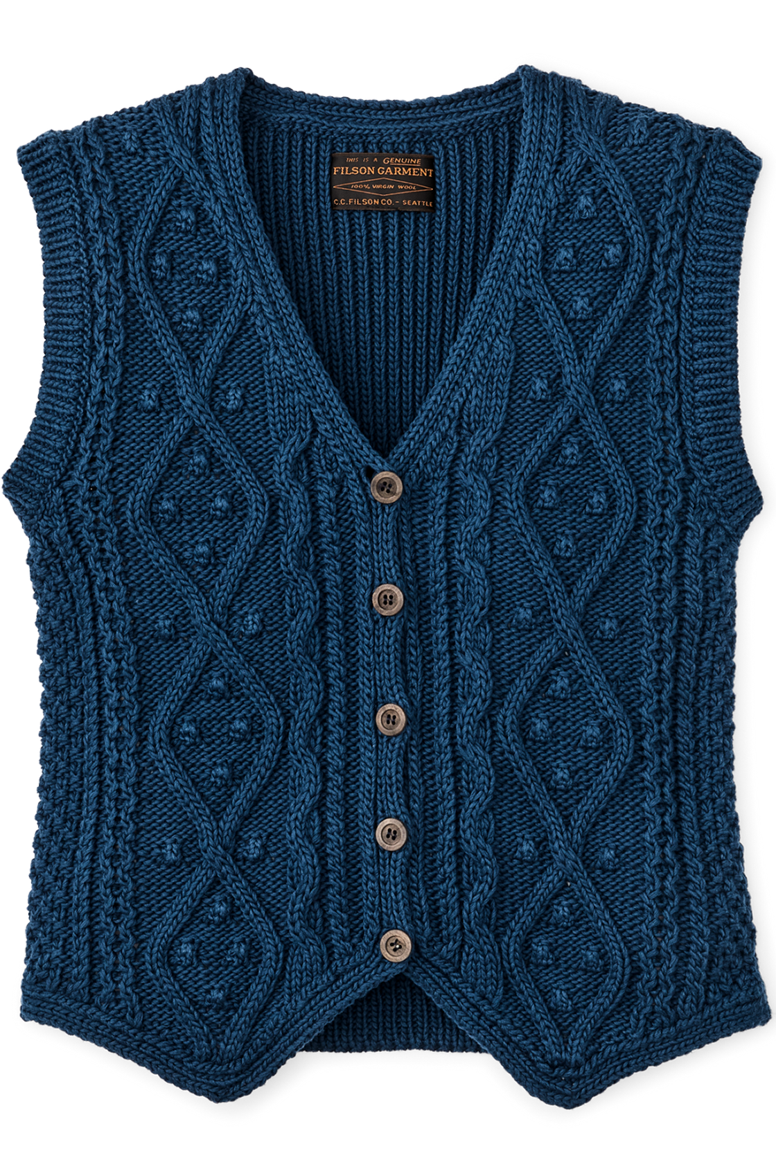 Knitted with 100% pure organic cotton, this comfortable vest provides core warmth. The heritage of the cable-knit pattern traces back to the historical sweaters that insulated vintage mariners from cold North Sea weather. V-neck with button-front closure. Waist-length with pointed front hem.
