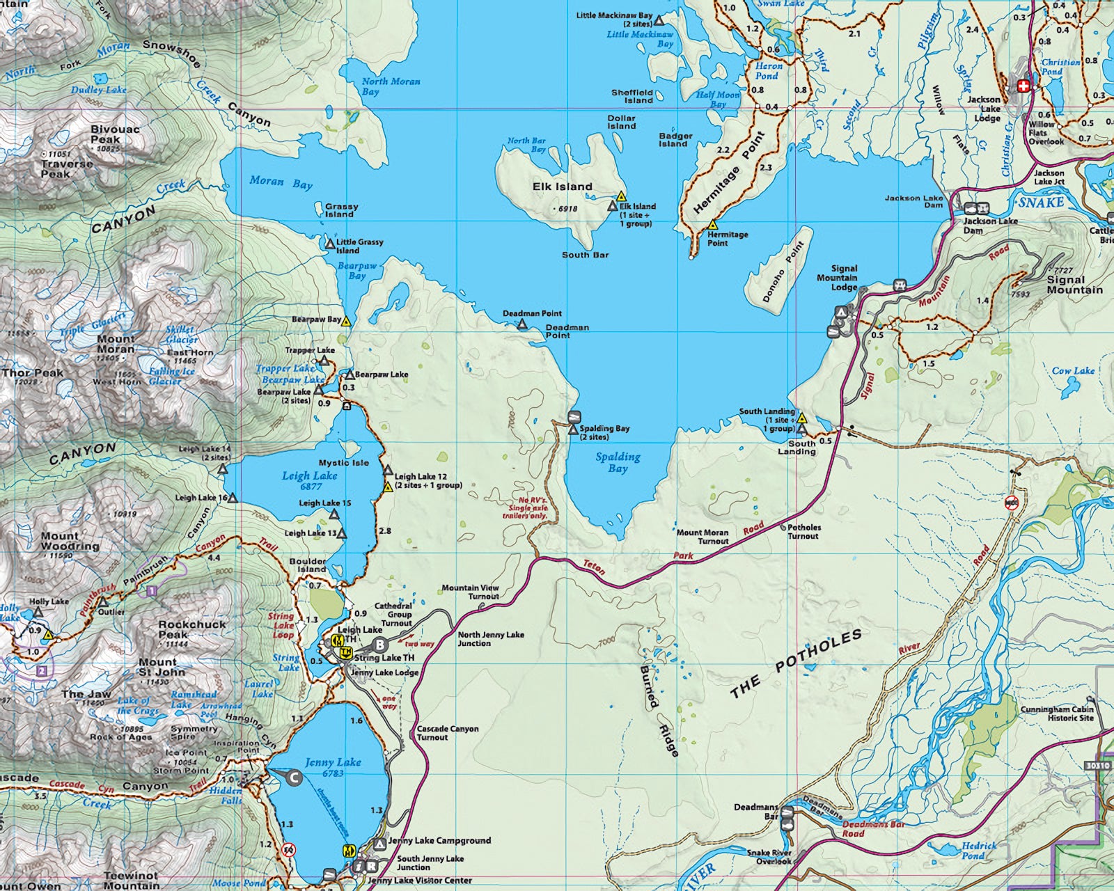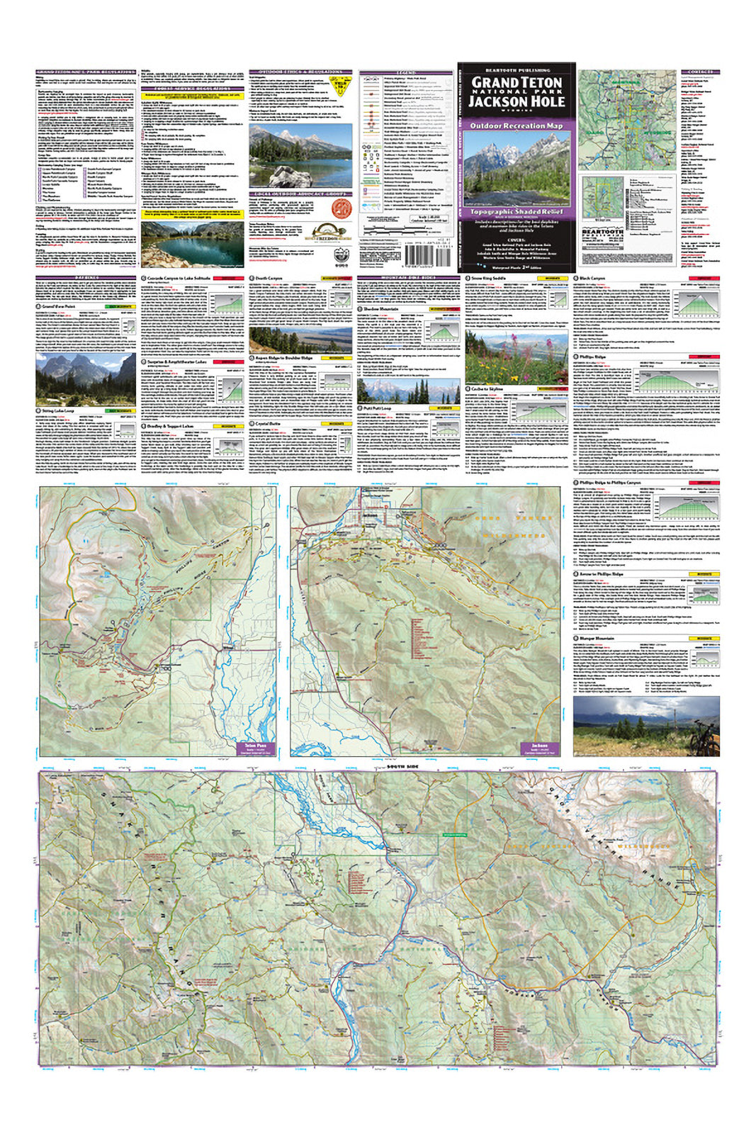 This map covers from the southern border of Yellowstone National Park to south of Hoback Junction. It covers all of Grand Teton National Park and the Jedediah Smith Wilderness, as well as the western portions of the Teton and Gros Ventre Wilderness Areas. There are two 1:40,000 scale detail maps for the dense trail systems of Teton Pass and the Jackson / Cache Creek area. The map also includes descriptions for eight local hikes and nine local mountain bike rides.
