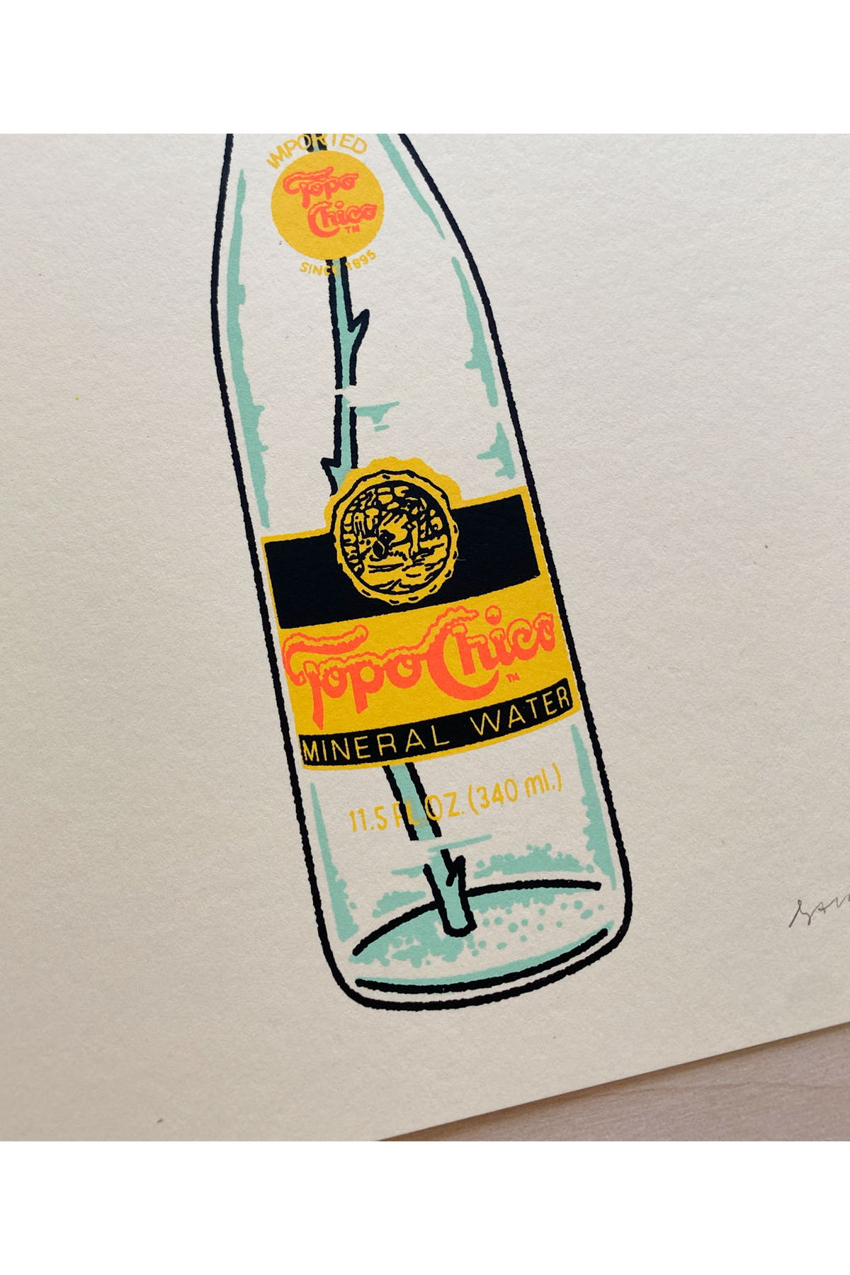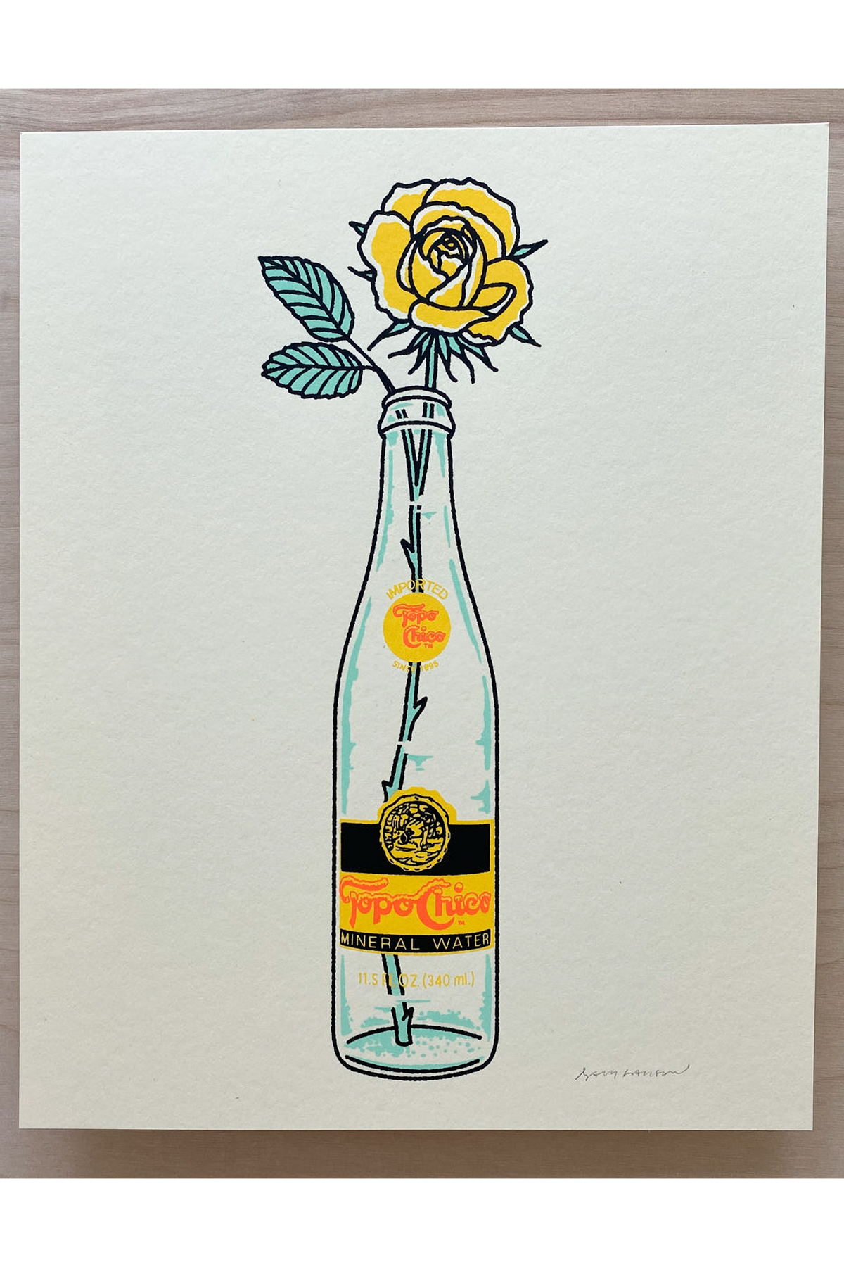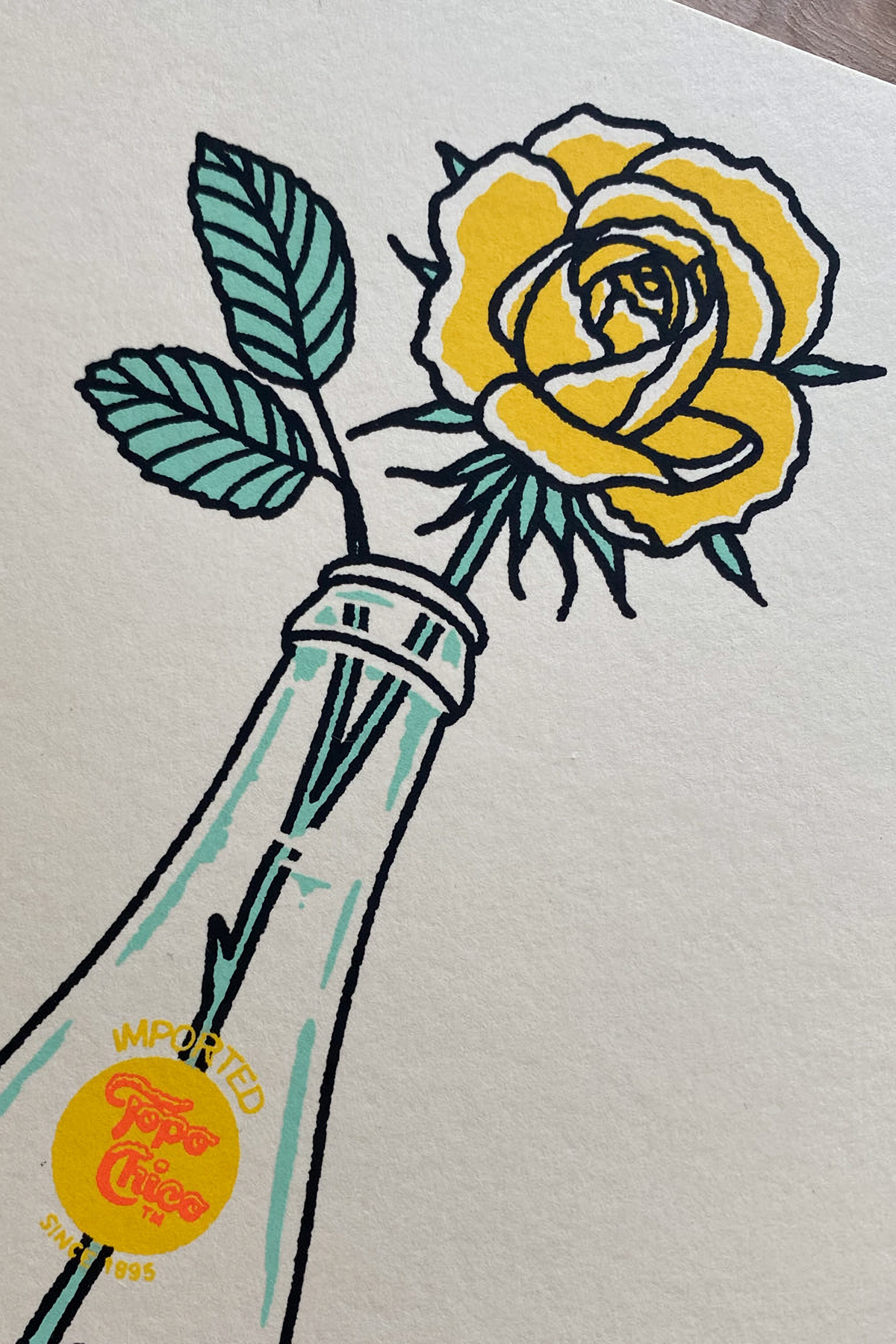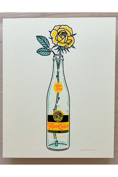 Printed with yellow, neon red, mint and black ink on premium 130 lb cream paper. Due to the recycled content of the paper, tiny specs may occur.